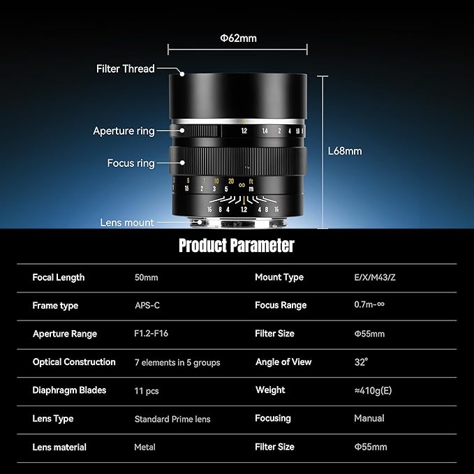 Il nuovo 7artisans 50mm F1.2 APS-C sfrutta uno schema ottico da 7 elementi in 5 gruppi, offre diaframma a 11 lamelle e mette a fuoco a partire da 70cm. Ha un diametro del porta filtri di 55mm, è costruito in metallo e offre un paraluce integrato.