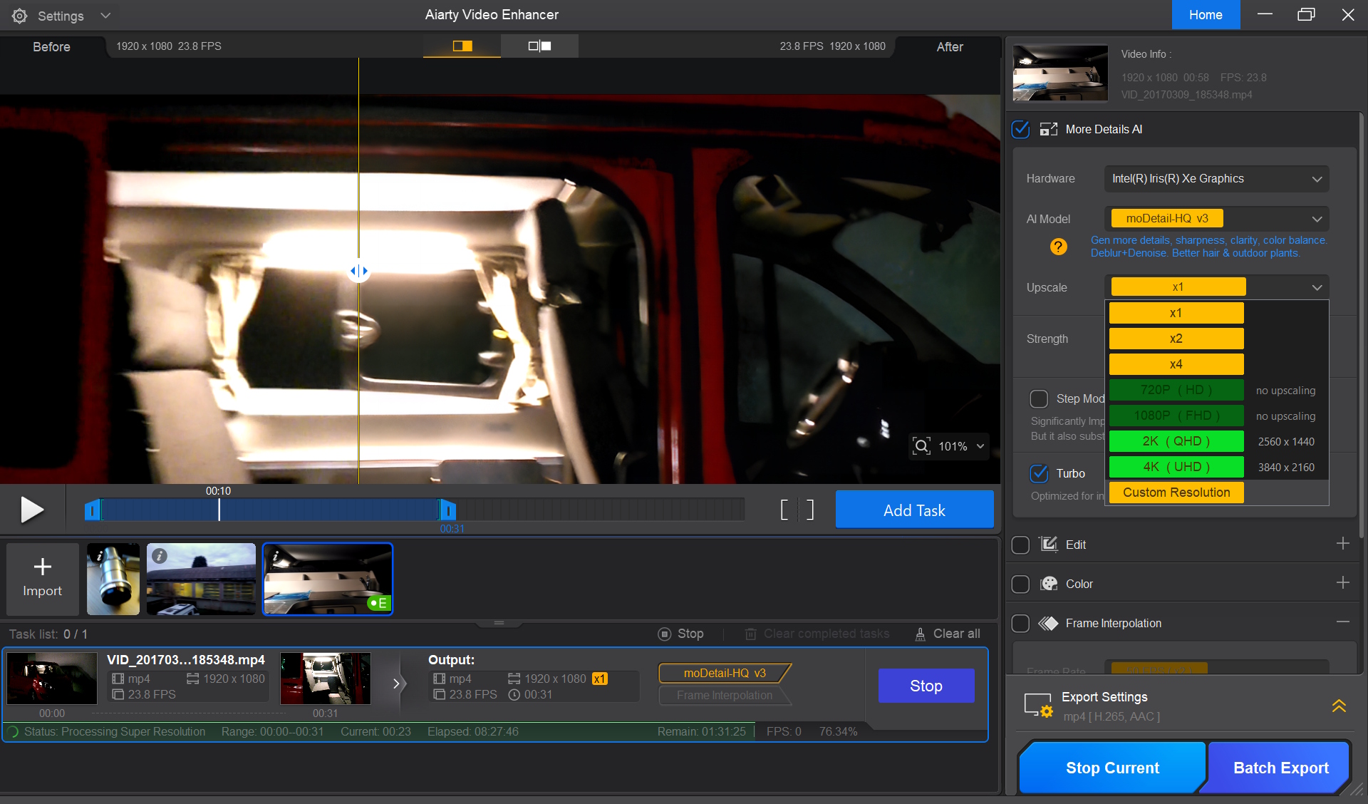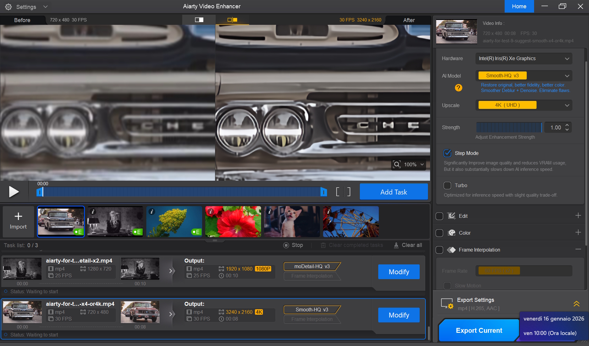 Aiarty Video Enhancer vuole essere innanzitutto uno strumento alla portata di tutti, senza troppe complessità. L’interfaccia è semplice e permette, nel pannello di destra, di applicare a cascata le regolazioni desiderate.