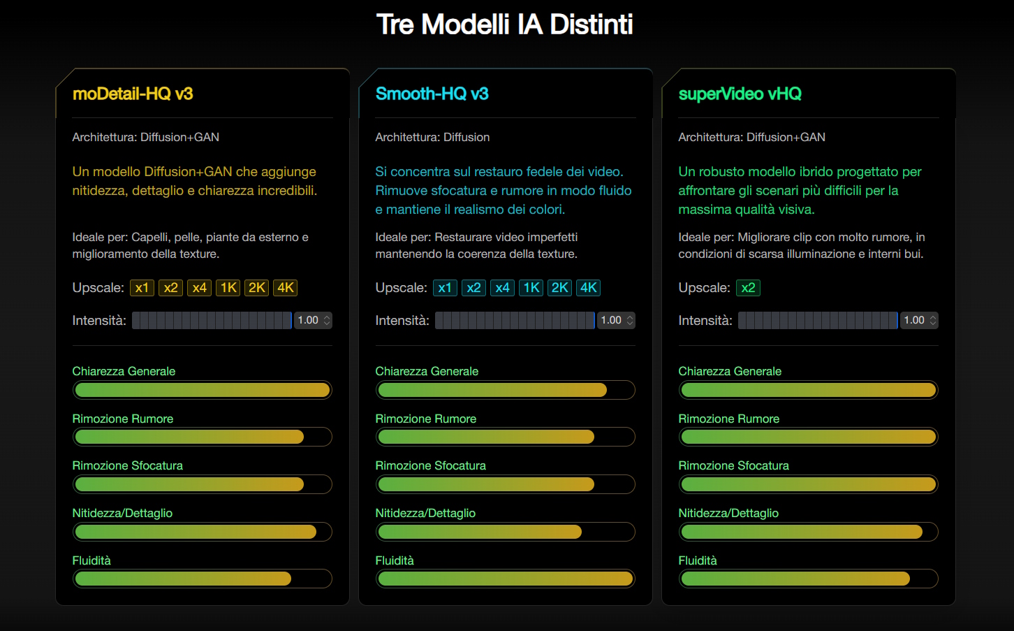 Il software si basa su diversi modelli di intelligenza artificiale progettati per affrontare problemi specifici. Alcuni sono orientati alla ricostruzione dei dettagli fini, come texture e superfici, altri alla riduzione del rumore mantenendo un aspetto realistico, altri ancora al recupero di video fortemente compromessi da scarsa illuminazione o compressione aggressiva. L’uso di architetture AI evolute consente di rigenerare informazioni visive perse, limitando artefatti e sovra-elaborazioni.