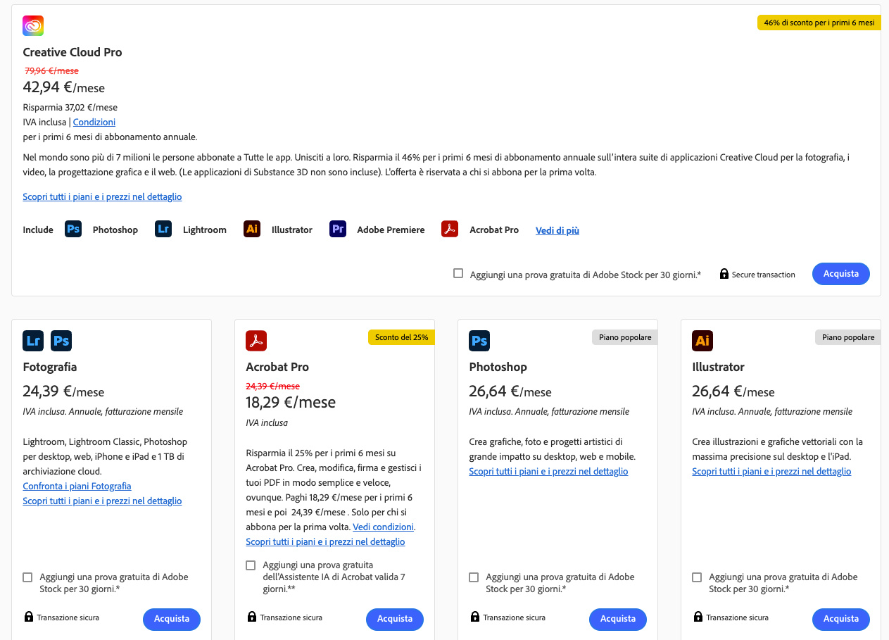 Adobe offre anche piani singoli per singole app come Premiere Pro, Photoshop e Lightroom che costano circa 26,64 euro al mese, sempre nel piano annuale con addebito mensile.