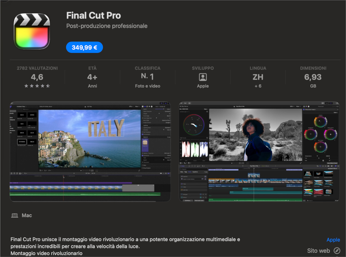 Final Cut Pro è acquistabile singolarmente per un prezzo una tantum (su Apple Store) di circa 349,99 euro.