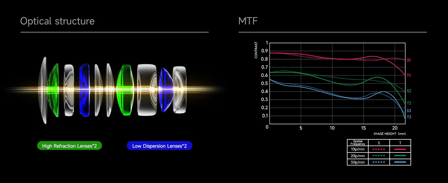 Rispetto al fratello più luminoso, la scelta di un progetto ottico meno estremo porta benefici non solo sui costi, ma anche sulle prestazioni. Se la versione f/0,95 mostra un MTF con nitidezza ai bordi davvero scarsa, il nuovo f/1,05 dovrebbe risultare molto più utilizzabile su tutto il campo inquadrato.