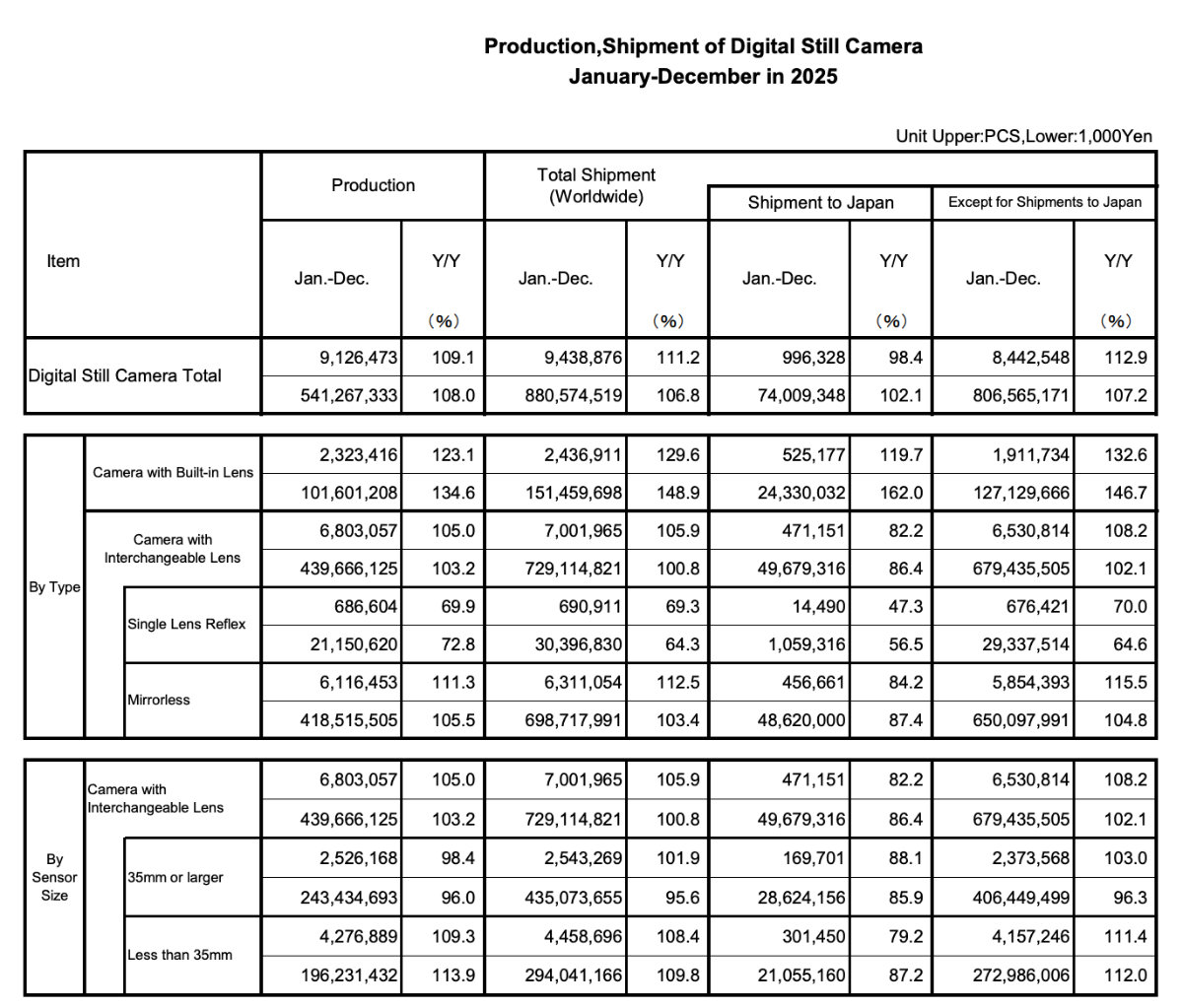 Prima di entrare nel dettaglio, vale la solita nota: CIPA raccoglie i dati dei produttori giapponesi, quindi non include Cina e Corea. Al momento attuale per le fotocamere non è un problema, in pratica resta fuori solo Leica tra i marchi più noti, ma con numeri statisticamente non rilevanti. Per gli obiettivi invece il discorso è diverso, visto che sul mercato troviamo parecchie proposte di marchi cinesi e coreani. La CIPA resta comunque la fonte più completa e affidabile per capire dove sta andando il mercato.