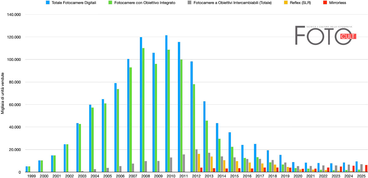Per confronto, i primi dati relativi alle fotocamere digitali a ottica intercambiabile della CIPA vedono circa 845.000 pezzi spediti nel 2003. Al momento della nascita delle mirrorless, nel 2012 dalle rilevazioni CIPA, il mercato delle reflex digitali cubava 16,2 milioni di pezzi. Quello in realtà è stato l’anno di picco per il segmento delle fotocamere a ottiche intercambiabili, in un mercato che nella sua globalità già era in calo dopo lo sgonfiamento della bolla delle compatte digitali. I numeri sono andati via via calando vedendo un rimbalzo verso l’alto per le fotocamere a ottica intercambiabile nel 2021 (trainato dal successo delle mirrorless) e tornando in positivo nel suo complesso solo nel 2024.