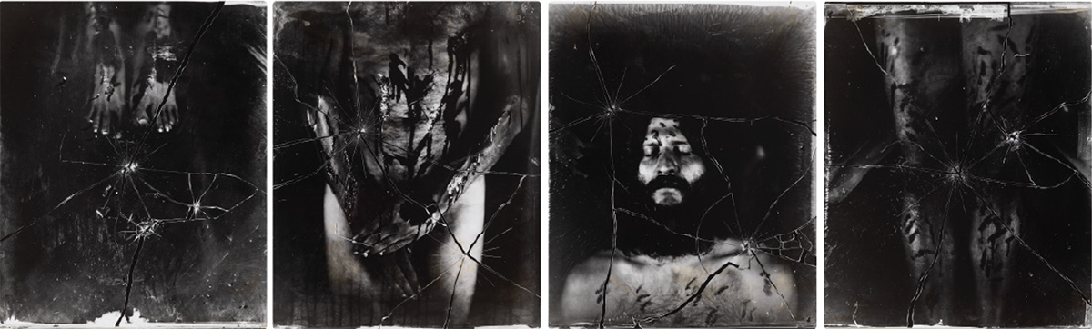 Dunque, si inizia da una sorta di Pasqua rivisitata, un Cristo risorto che porta i segni della passione, e regge Maria, simbolo dell’umanità, ribaltando uno degli archetipi più profondi della tradizione cristiana. Superata quest’opera, intitolata DE SECUNDA PIETATE, si entra nel cuore del percorso espositivo con SCHEGGE MISTICHE, ossia quattro lastre stampate su carta ai sali d’argento spezzate prima dell’esposizione alla luce, che l’autore descrive così: “La frattura precede la visione. La luce non rivela, ma trasforma. Non reliquie, ma immagini ferite, frammenti di un corpo e di una memoria che parlano della Passione come condizione umana, non come dogma”.