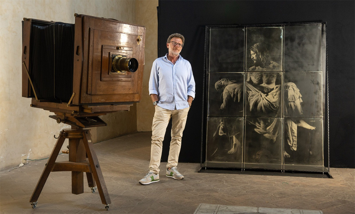 Oltreché rovesciata, la Pietà è scomposta in nove grandi lastre stampate su carta ai sali d’argento, realizzate con la tecnica del collodio umido e un imponente banco ottico di fine Ottocento – incluso nell’allestimento – che il fotografo ha ritenuto lo strumento adatto a restituire all’immagine il suo peso, il suo tempo e la sua responsabilità in un’epoca dominata dalla fotografia istantanea.