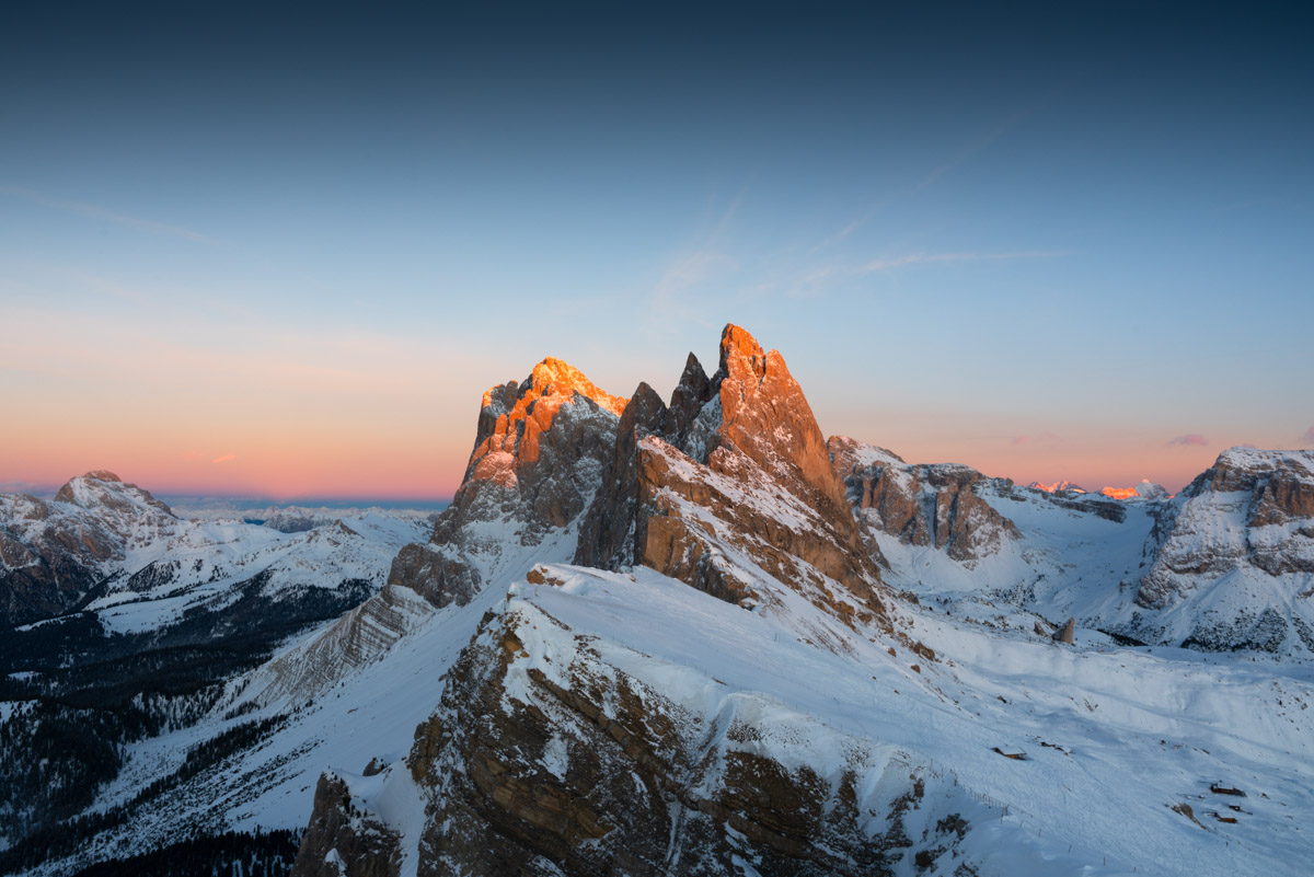 Molte le immagini in cui l’ombra abbraccia la montagna mentre la luce si accaparra qualche vetta accendendo rocce e neve con i toni caldi dell’alba e del tramonto.