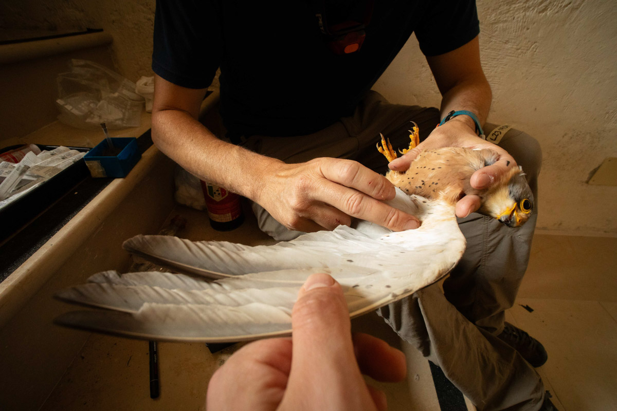 Durante la rilevazione delle misure biometriche di un maschio di grillaio le dita di un ricercatore cercano la vena branchiale nell'ala dell'uccello per effettuare un prelievo di sangue.