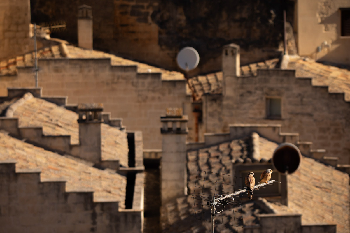 Una coppia di grillai posati su un'antenna nella Civita di Matera. © Luca Eberle
