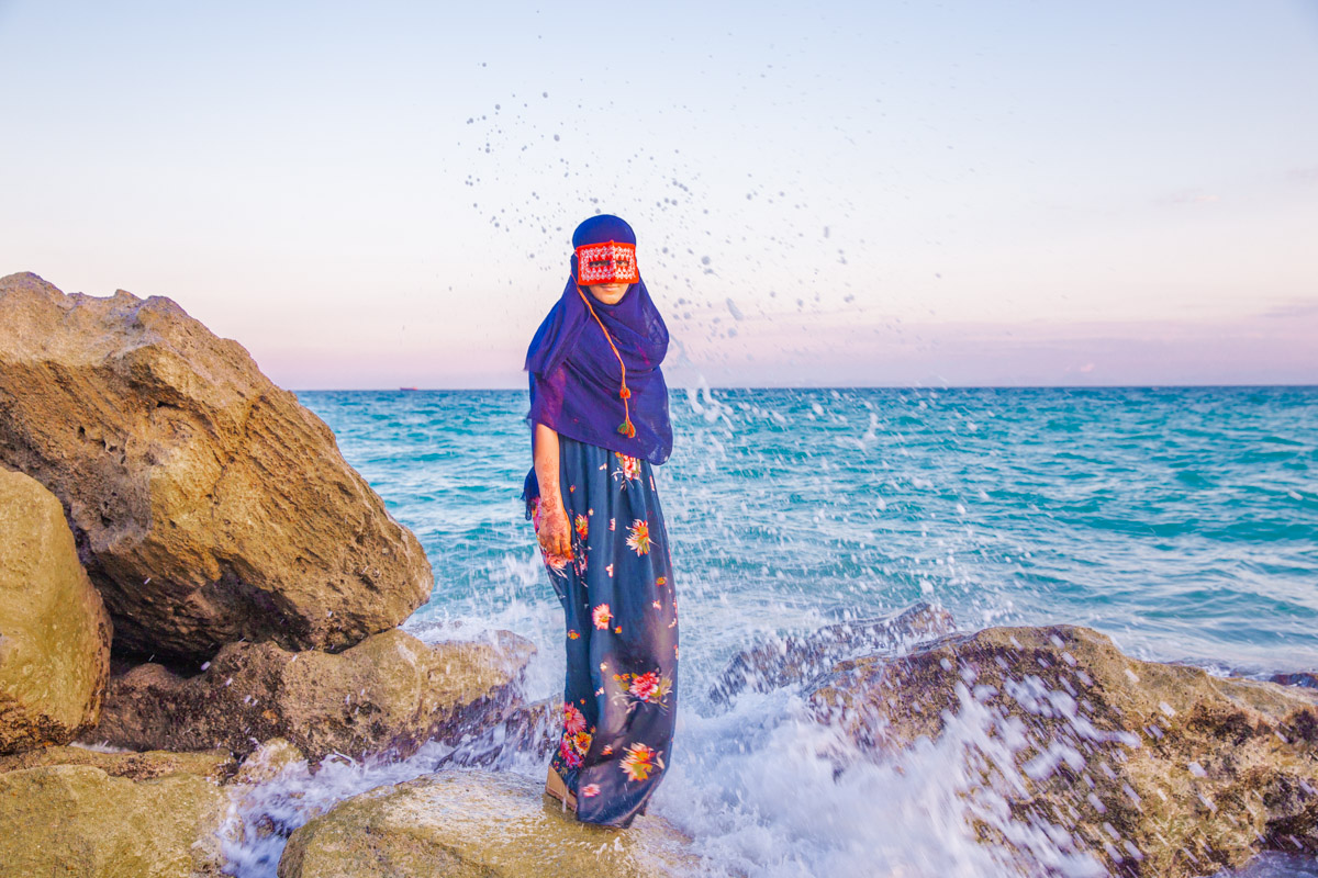 Masoumeh in piedi sulla spiaggia dopo una lunga e dura giornata di lavoro. A volte esce in mare con sua madre, ma principalmente lavora in una piccola bancarella, dove realizza gioielli fatti a mano con le conchiglie che raccoglie lungo la riva e li vende. Le donne dell’isola creano collane e orecchini con le conchiglie raccolte e li vendono ai viaggiatori. Questa è una delle loro fonti di reddito.