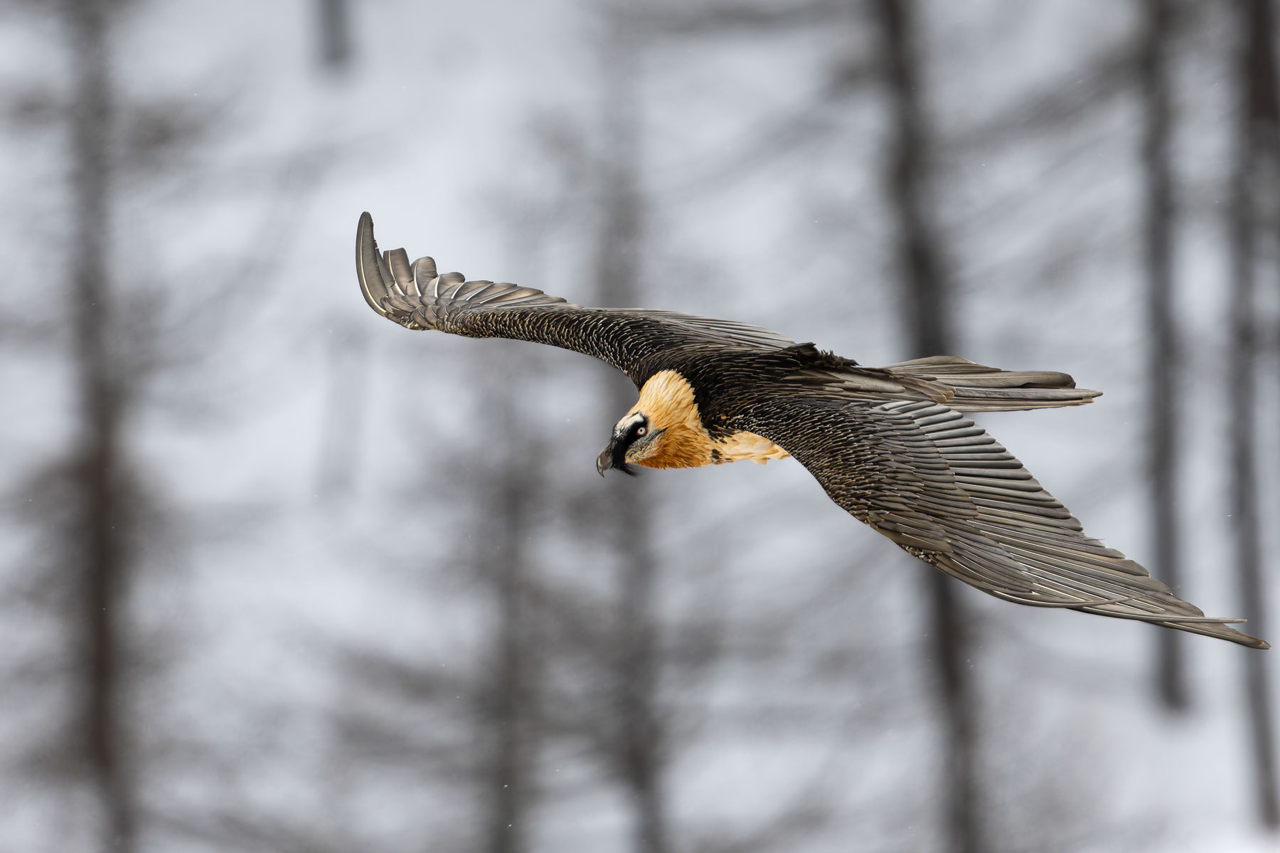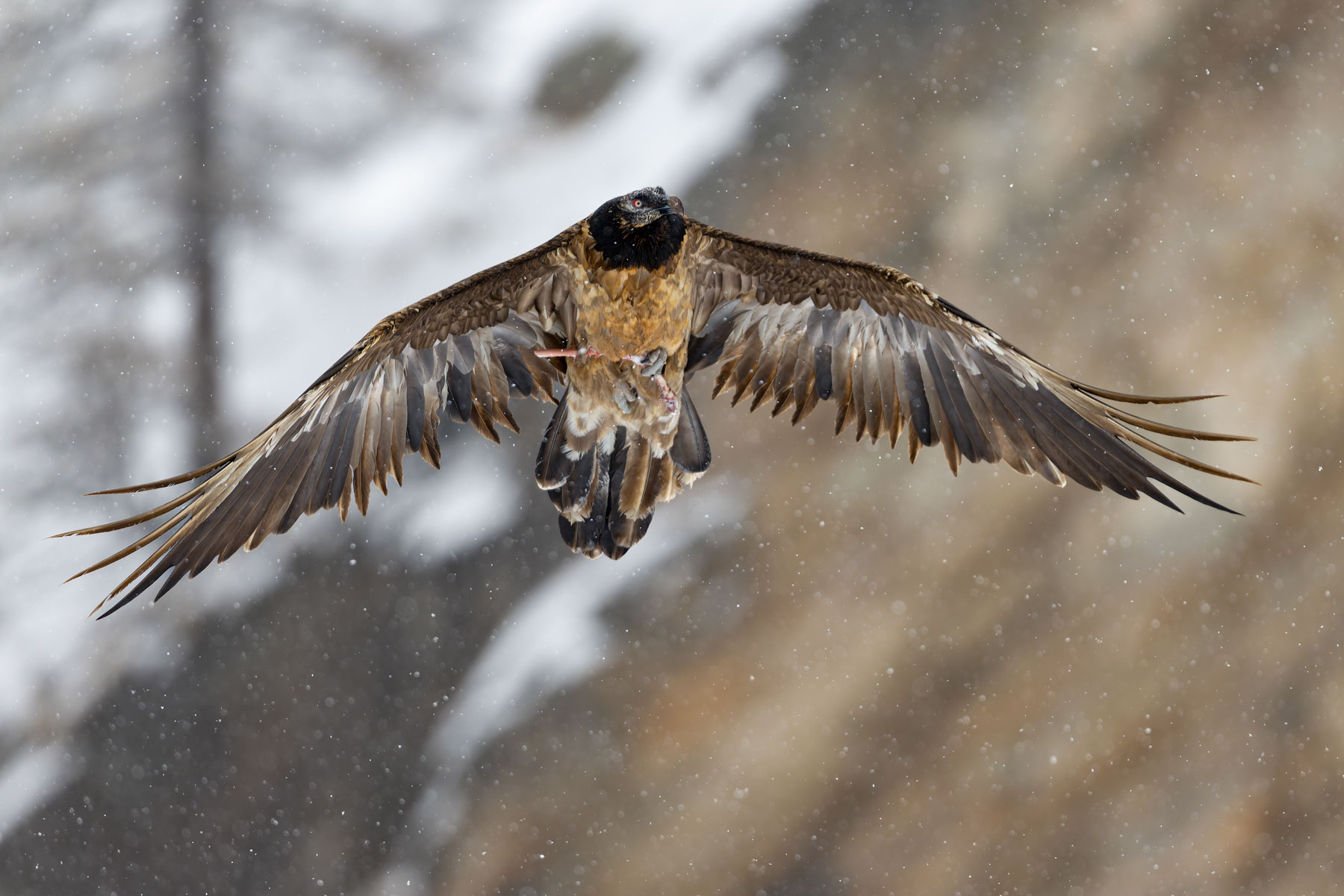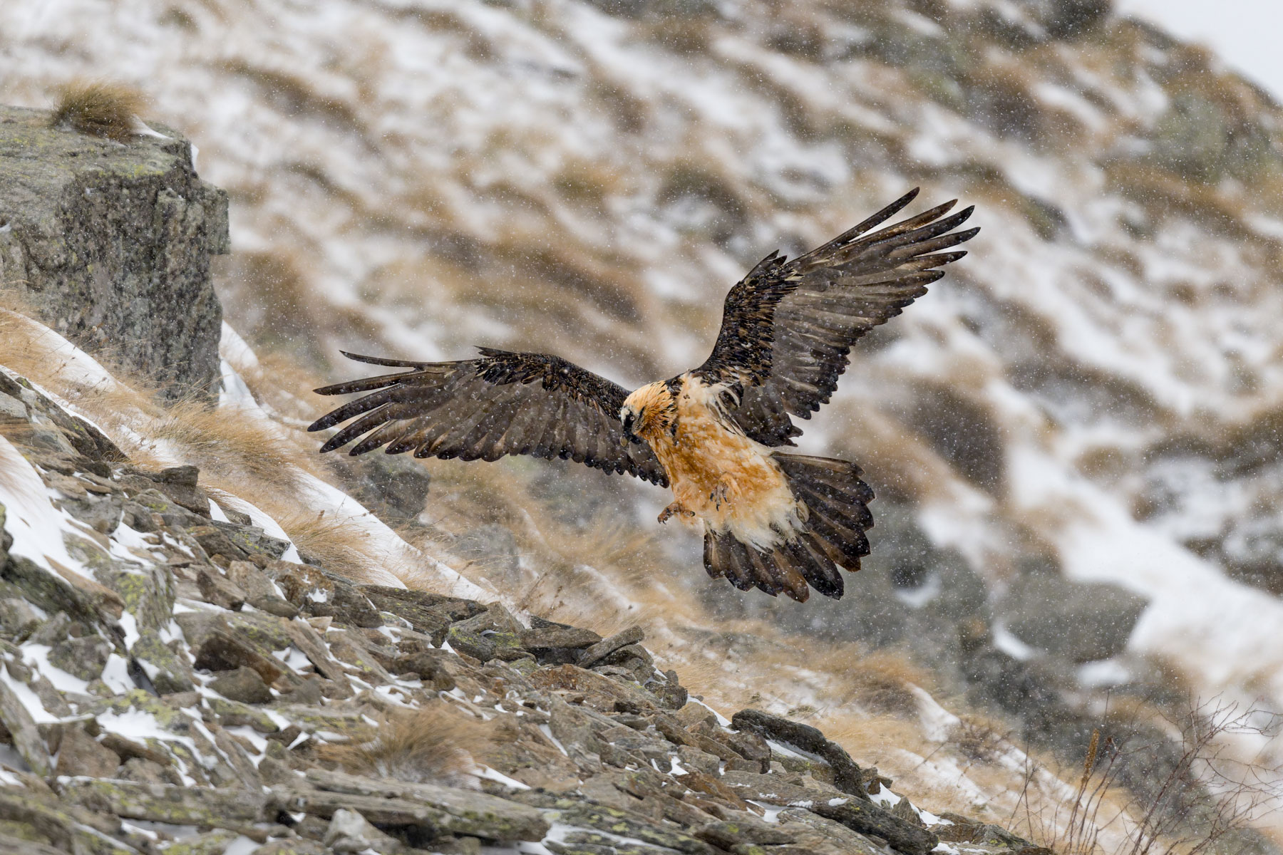 Il più delle volte il gipeto si lascia osservare nelle sue maestose planate di ricognizione, mentre è in cerca di carcasse di ungulati e ossa, che ogni tanto lascia cadere da altezze considerevoli perché si frantumino e risultino più facili da ingoiare. È in quei momenti che Davide scatta la maggior parte delle sue fotografie, catturando una sorprendente quantità di dettagli per ogni singolo uccello che passa davanti al suo obiettivo.