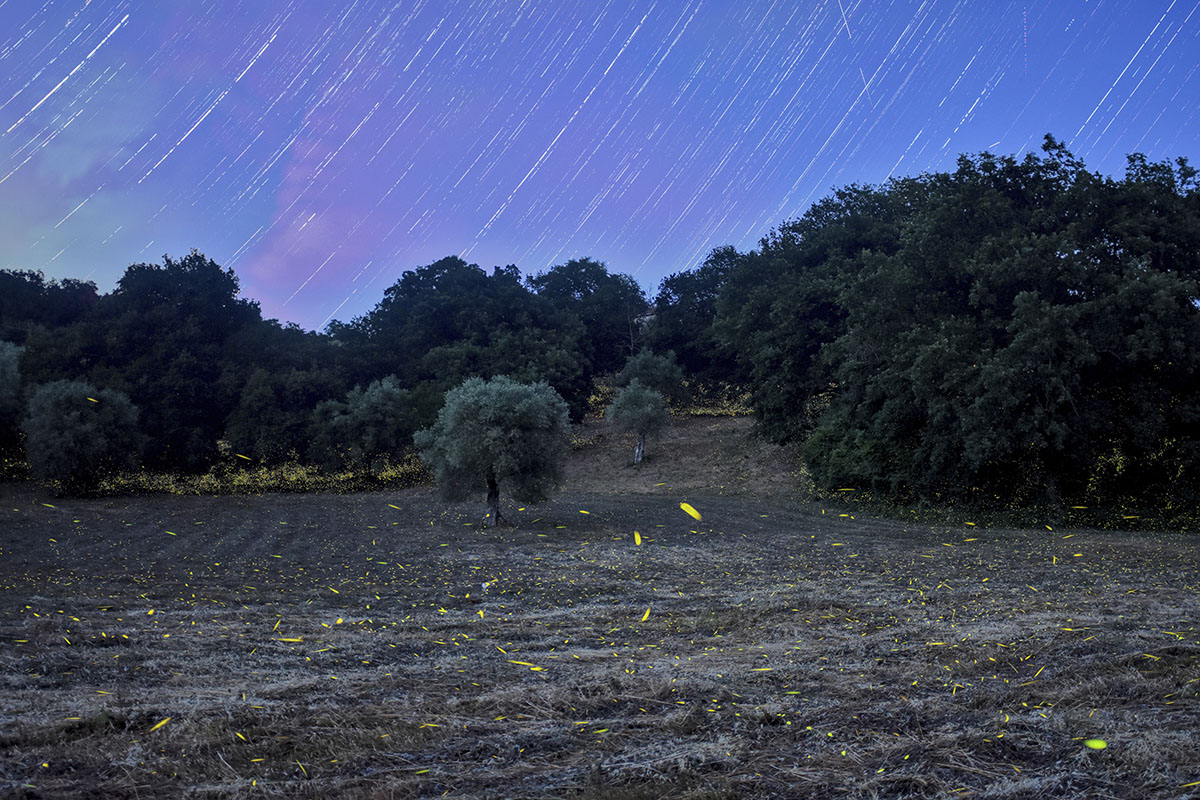 Per realizzare la foto in apertura di questo articolo, ad esempio, Massimo ha posizionato la fotocamera su treppiedi a circa 60cm da terra, immediatamente sotto la chioma di un albero. “Sapevo che a quell’altezza avrei intercettato la fascia più attiva di lampeggi – ci ha raccontato – quella in cui la danza luminosa raggiunge la sua massima intensità. Non volevo osservare le lucciole dal basso, né dall’alto, volevo essere nel mezzo, dentro quel battito di luci.