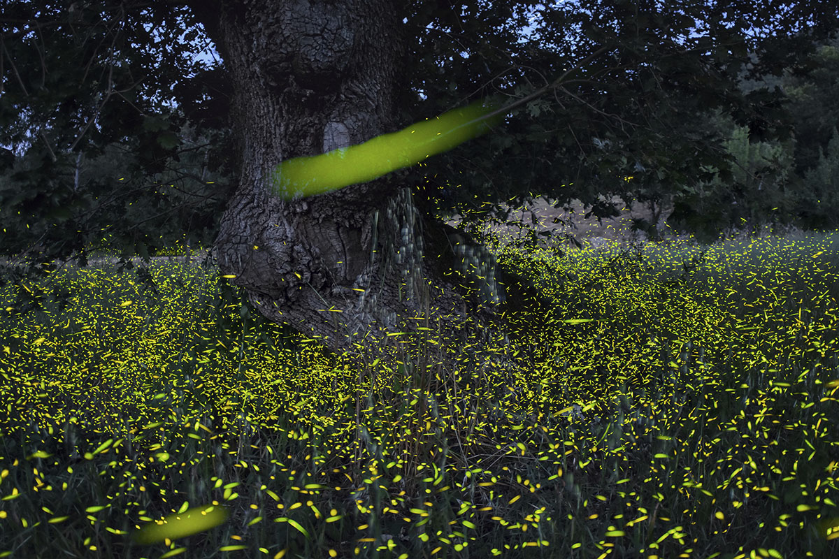 Sotto la chioma le condizioni sono perfette, perché la luce artificiale non arriva, l’umidità è costante e l’ambiente è protetto. Lì, in quel punto preciso, la fotocamera è letteralmente immersa nel cuore del fenomeno, circondata dai voli intermittenti. Quando finalmente l’otturatore si apre e la notte si scrive da sé sul sensore il fotografo ha già fatto il lavoro più importante: ha atteso consapevolmente”.
