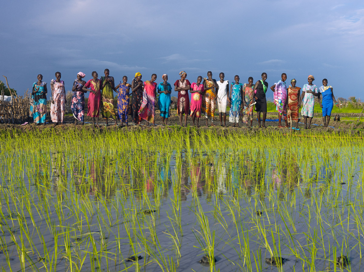 L’organizzazione non governativa Action Against Hunger ha creato un progetto pilota di successo per insegnare alle donne delle comunità a coltivare il riso nei terreni alluvionati, al fine di mitigare la minaccia della fame. La formazione responsabilizza le donne locali e si rivela un’alternativa gradita alla ricerca di bulbi di ninfea nelle acque infestate dai coccodrilli. Questa immagine gioiosa è stata scattata alla fine di una lunga giornata dedicata alla semina del riso e il programma è stato ora implementato in varie zone soggette ad alluvioni del Sud Sudan.