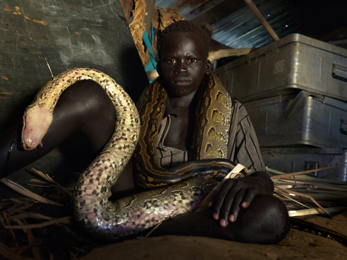 Bol, un bambino di dieci anni, posa per un ritratto con il pitone che ha ucciso nel cuore della notte precedente. Mentre dormiva, Bol ha sentito il verso dei suoi gattini in pericolo e poco dopo si è trovato faccia a faccia con il serpente. Nonostante suo padre fosse lontano, Bol ha combattuto contro l’enorme rettile per più di un’ora, fino ad ucciderlo. Attenderà il ritorno di suo padre prima di scuoiarlo per venderne la pelle. Proprio come gli abitanti del villaggio, anche i serpenti sono alla ricerca di terreni più elevati e i morsi di serpente sono comuni durante le inondazioni.