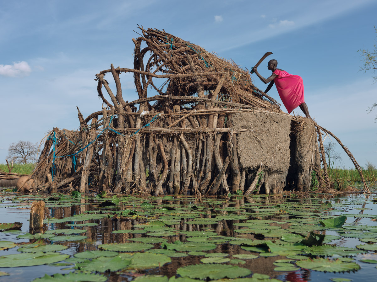 Nyachuana Lok, sta smantellando la sua casa distrutta per ricostruirla sulla piattaforma galleggiante che ha realizzato compattando l’erba fino a renderla abbastanza robusta da sostenere una casa. Il legno è ormai un bene raro, poiché molti alberi sono morti a causa delle continue inondazioni e la maggior parte di essi è già stata prelevata.