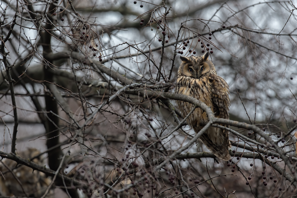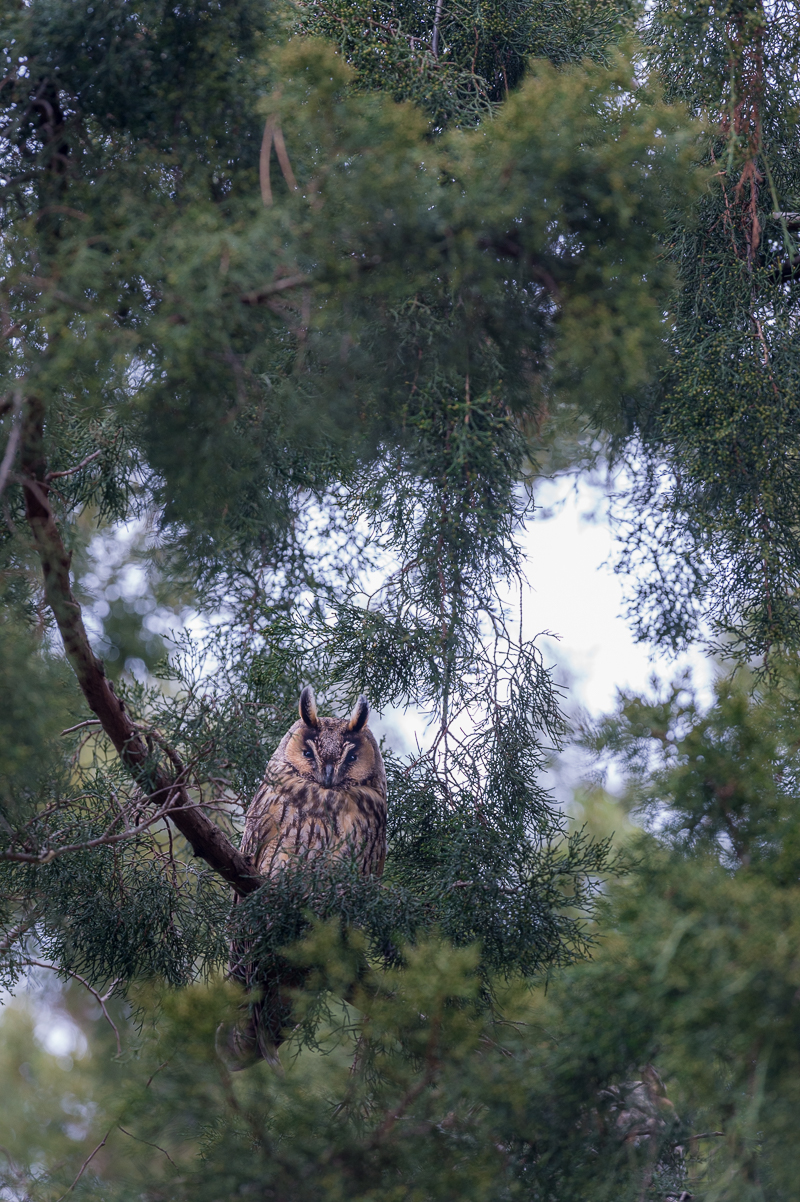 Attento a non arrecare disturbo agli animali, Silvano si è mosso in cerca degli spot più idonei, facendo rimbalzare lo sguardo tra svariati alberi più o meno ricchi di foglie… ma sempre partendo dal basso, perché l’occhio esperto e preparato di un fotografo in cerca di gufi sa che la caccia al soggetto inizia dal terreno.