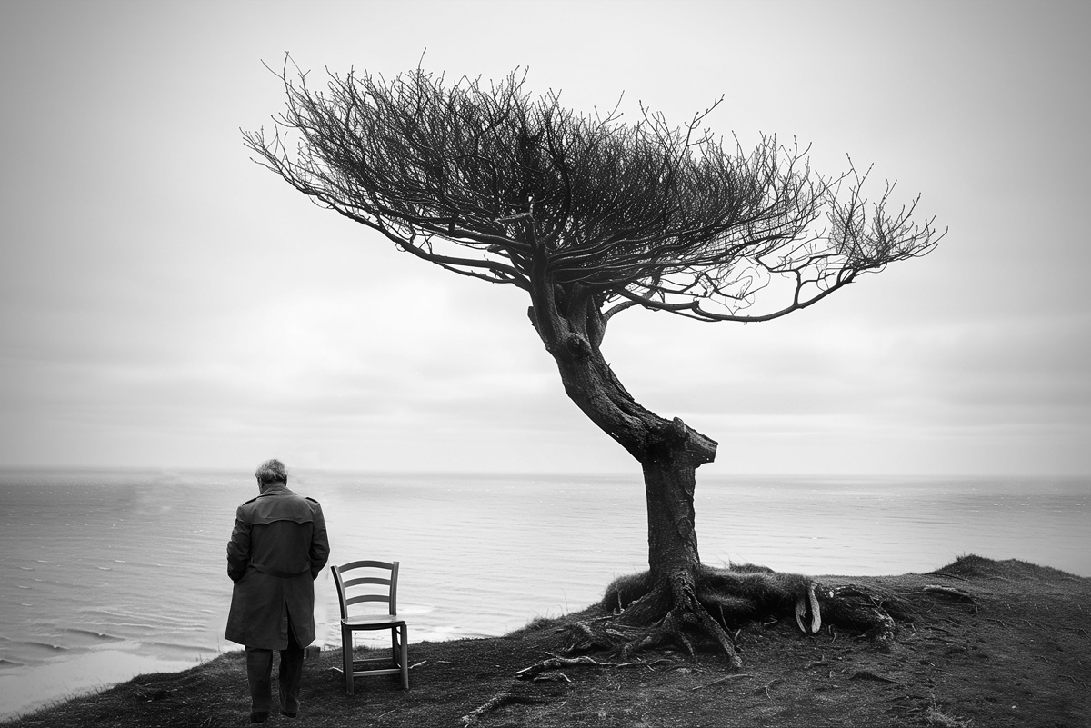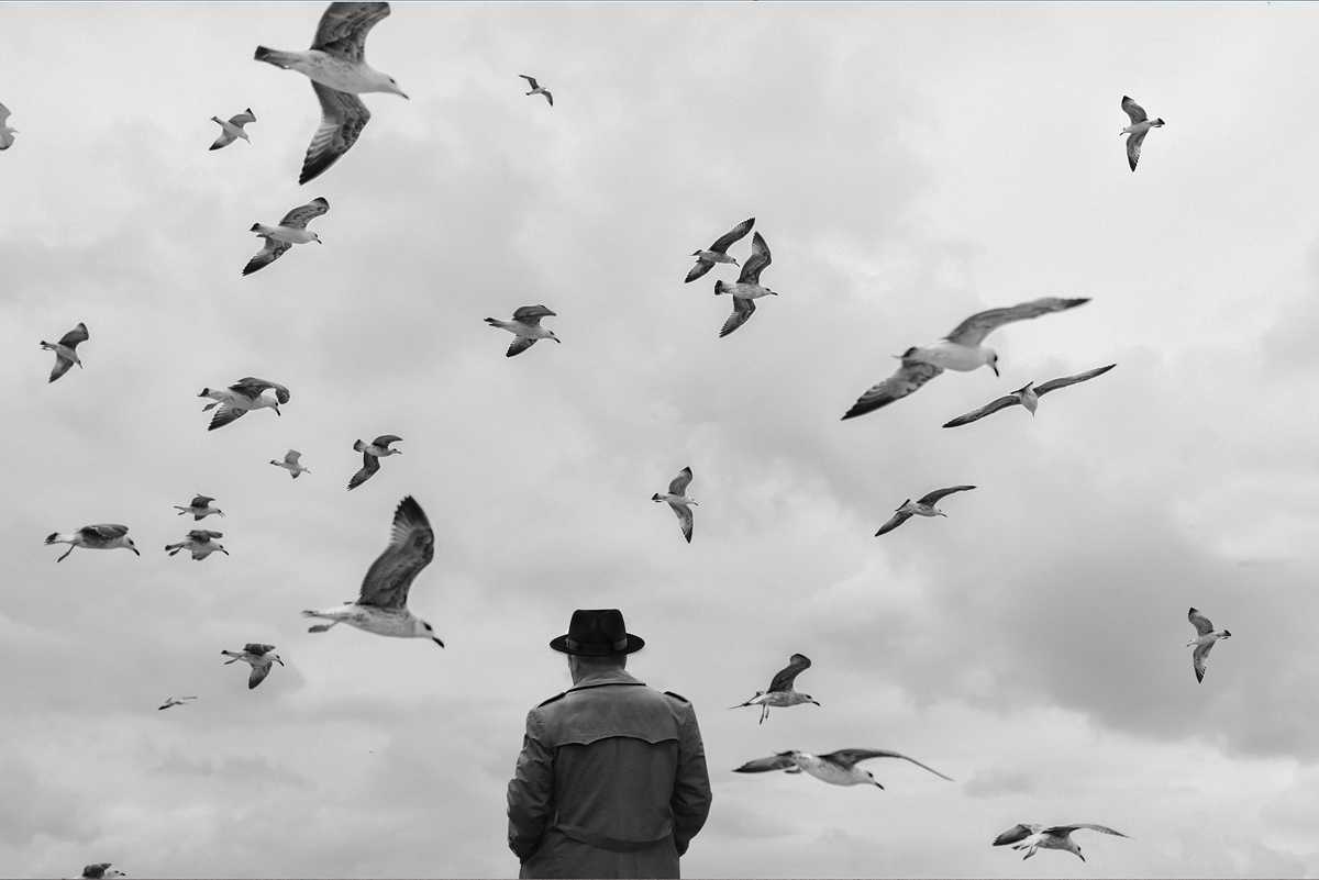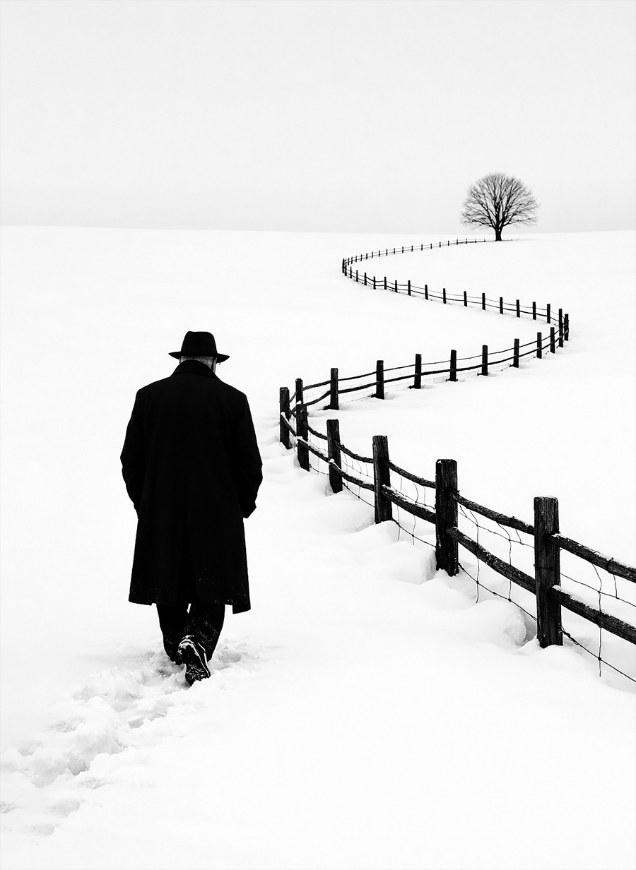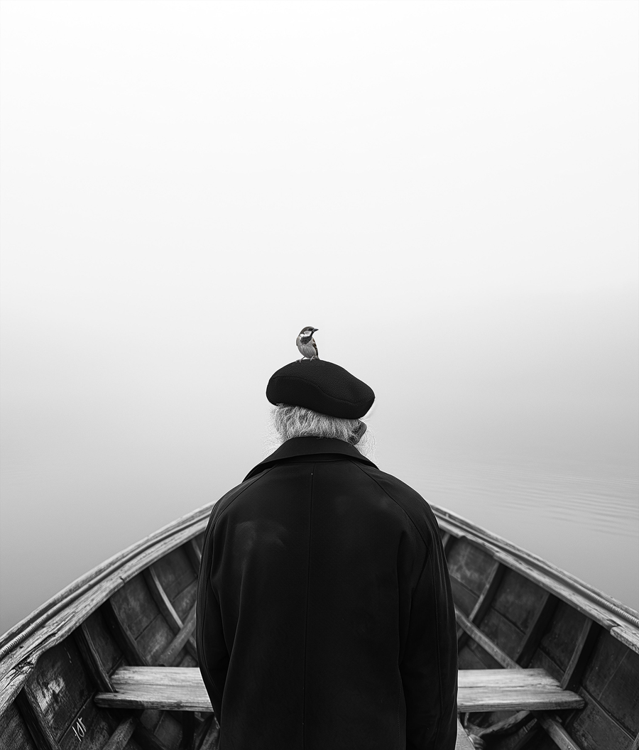 In questo modo, lo spettatore può entrare nell’immagine e proiettare sulla figura la propria narrazione interiore. Il cappello fa pensare a un personaggio di una favola o di un’allegoria. Quando compare un uccello, entra in scena un’altra dimensione: il dialogo tra la mente umana e il mondo naturale. Gli uccelli spesso evocano il pensiero, la libertà o la possibilità di trascendenza. Insieme, la figura immobile e l’uccello creano una quieta tensione tra gravità e leggerezza, tra il peso dell’esistenza e il desiderio umano di elevarsi al di sopra di esso.
