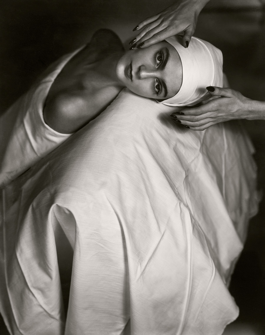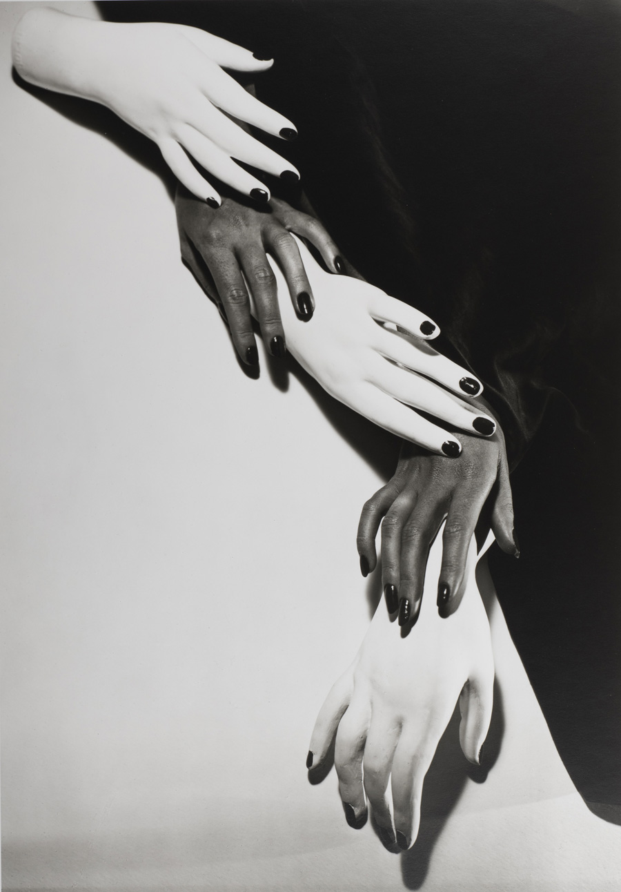 Attraverso la luce, Horst possiede la capacità di scolpire il volume. L’ombra – uno dei protagonisti centrali delle sue immagini, e in particolare l’ombra proiettata – conferma la realtà fisica del soggetto, ma allo stesso tempo diventa forma e volume a sé stante. Così facendo, introduce una terza dimensione nell’immagine bidimensionale, creando una profondità trompe-l’œil che risuona con le influenze invisibili che attraversano l’opera di Horst, come fantasmi che abitano l’immagine. La luce, nella pratica di Horst, è scultorea: aggiunge, sottrae, ma crea anche intervalli – spazi di tensione formati da controforme. Queste controforme non sono secondarie, emergono da un modo di pensare proveniente dal Bauhaus in cui ciò che è visibile è significativo quanto i vuoti e gli spazi negativi che genera.