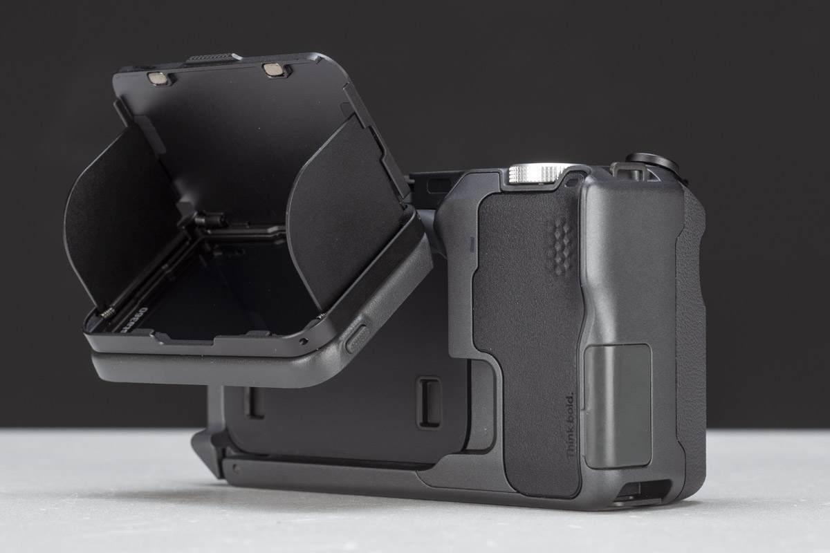 L’assemblaggio è consentito grazie a un’apertura laterale: una volta sganciata la chiusura, la action cam va inserita nell’alloggiamento, ma è necessario prima rimuovere fisicamente lo sportellino che protegge la porta USB della fotovideocamera. Questo passaggio serve a permettere l’innesto del connettore maschio presente dentro l’impugnatura, che mette in comunicazione i due dispositivi. Una volta chiusa la sede, i comandi fisici diventano operativi: il pulsante di scatto e le due ghiere permettono di gestire le funzioni principali in modo “classico” o meccanico, evitando di dover interagire con il touch screen, operazione spesso scomoda se si indossano guanti o se si sta operando in movimento.