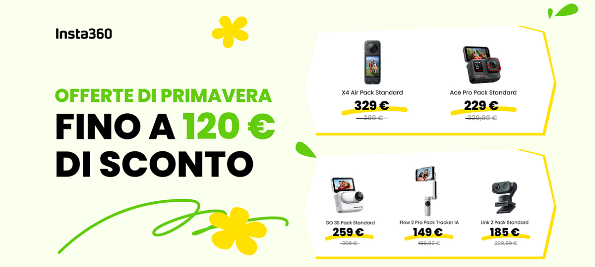 Tra i prodotti in promozione, acquistabili in sconto tra il 10 e il 17 marzo, rientrano anche altri modelli del sistema Insta360, come la minuscola e più abbordabile action cam Go 3S, le evolute Ace Pro e Ace Pro 2, nonché dispositivi di ripresa e ascolto dedicati alle videoconferenze online e supportati dall’AI, come la webcam Insta360 Link e il sistema di vivavoce Wave.