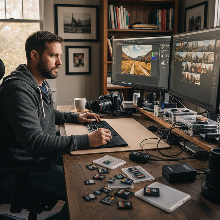 fotografo e schede di memoria scrivania post produzione