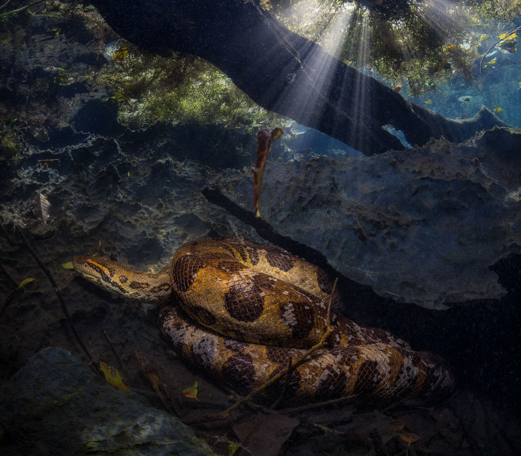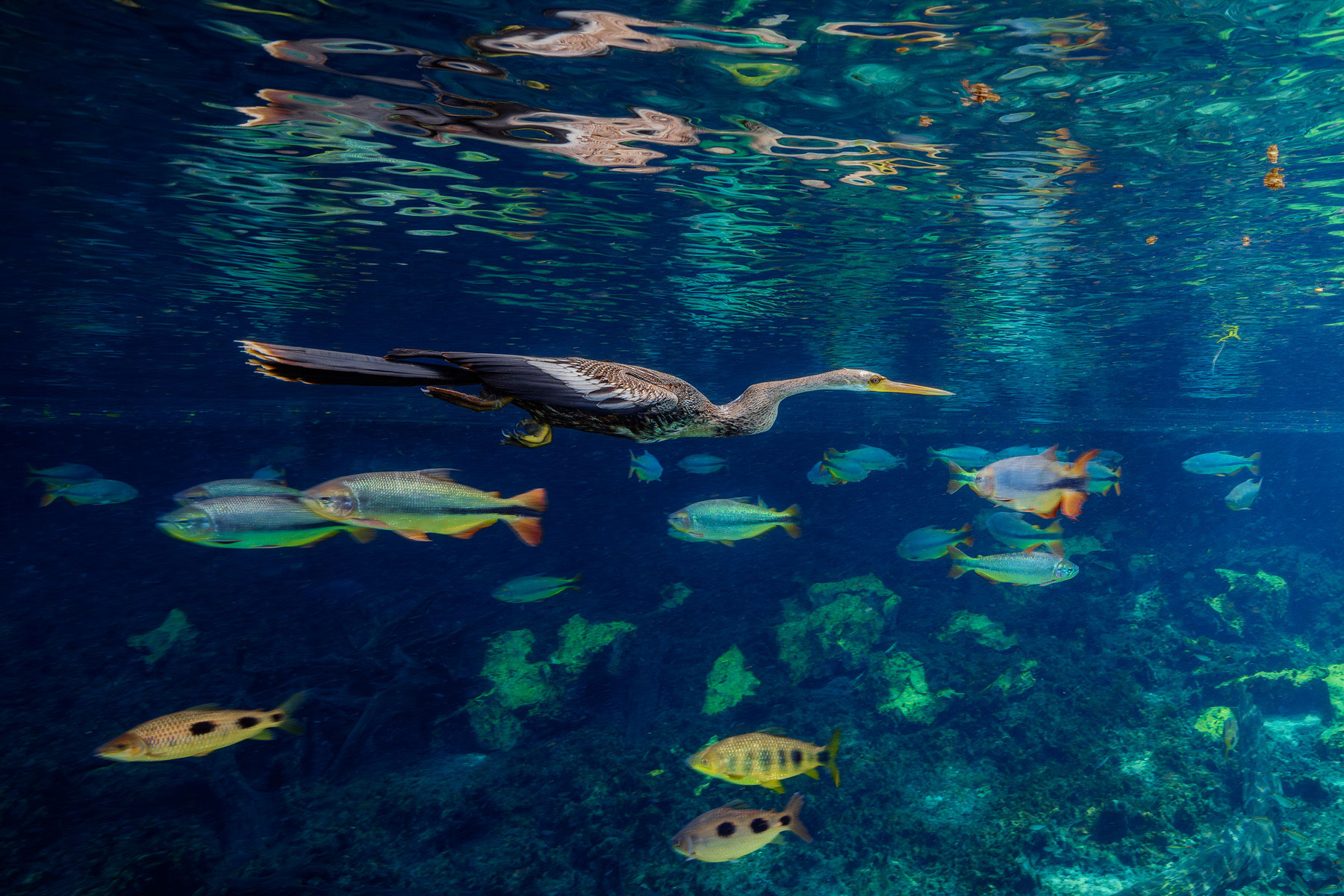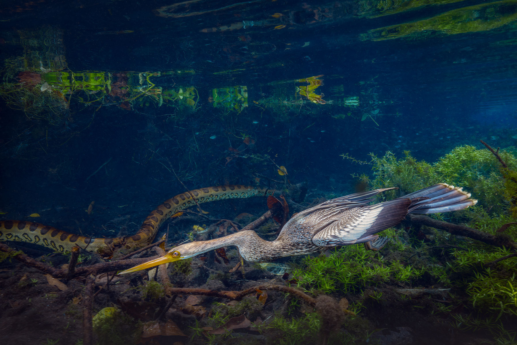 Nel suggestivo portfolio delle immagini subacquee pubblicate in questo articolo compaiono tutte le specie appena citate, che spesso condividono lo spazio della composizione fotografica. Le anaconde scivolano sotto la superficie dell’acqua, accanto ai biguatinga che sfrecciano freneticamente a caccia di pesci, con un’agilità che giustifica il soprannome di “scheggia” o “dardo” (dart) con cui i Paesi anglosassoni sono soliti riferirsi alla specie, che più precisamente chiamano darter.