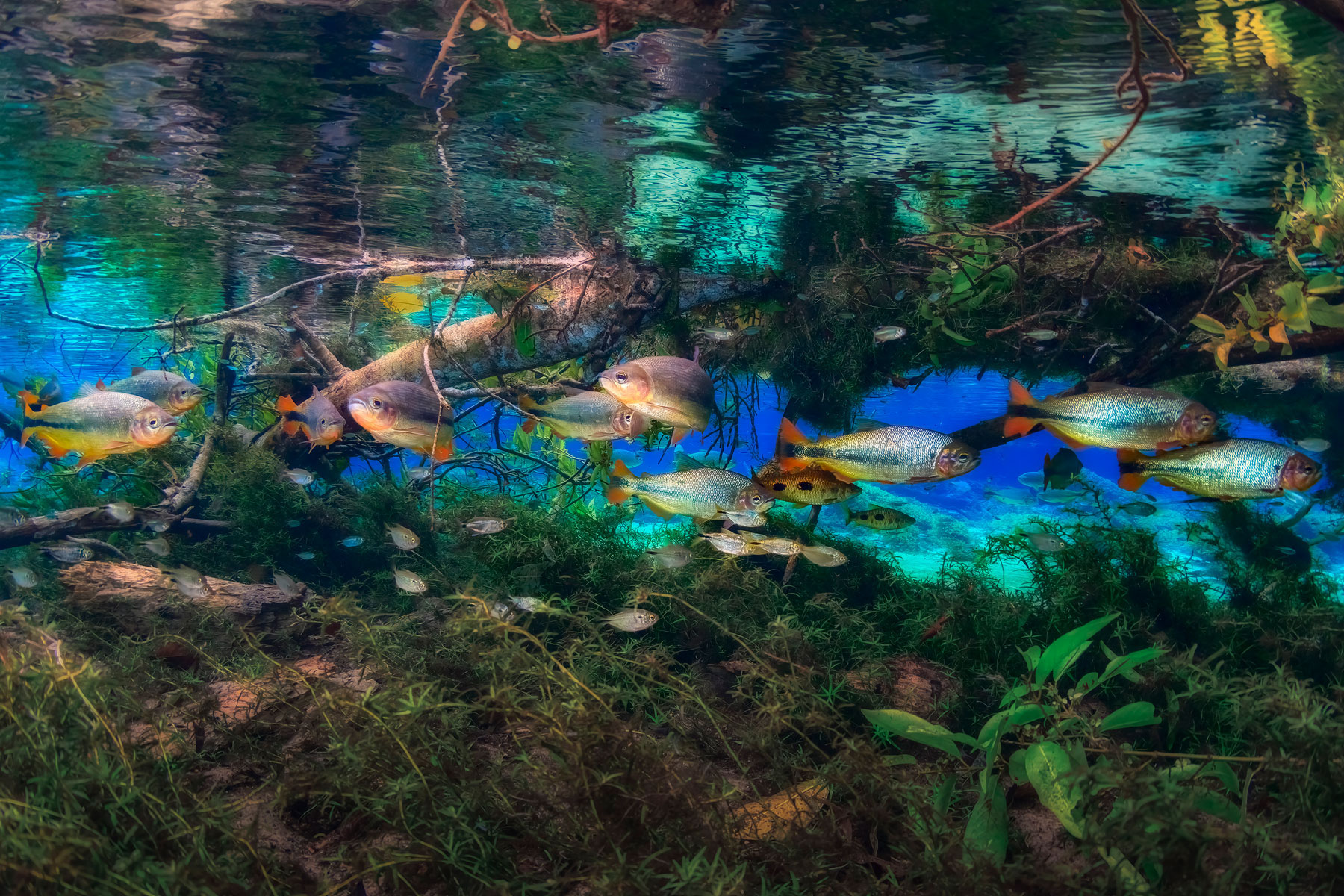 La vegetazione è rigogliosa, la natura prospera nelle acque cristalline del Rio Olho d’Água, un affluente del terzo fiume più pulito al mondo, il Rio da Prata. Il calcare fa da filtro naturale, le impurità si depositano sul fondale e l’acqua è straordinariamente limpida. I pesci abbondano, i predatori pure, si possono osservare caimani, anaconde, tapiri, capibara, giaguari e circa duecentoquaranta specie di uccelli.