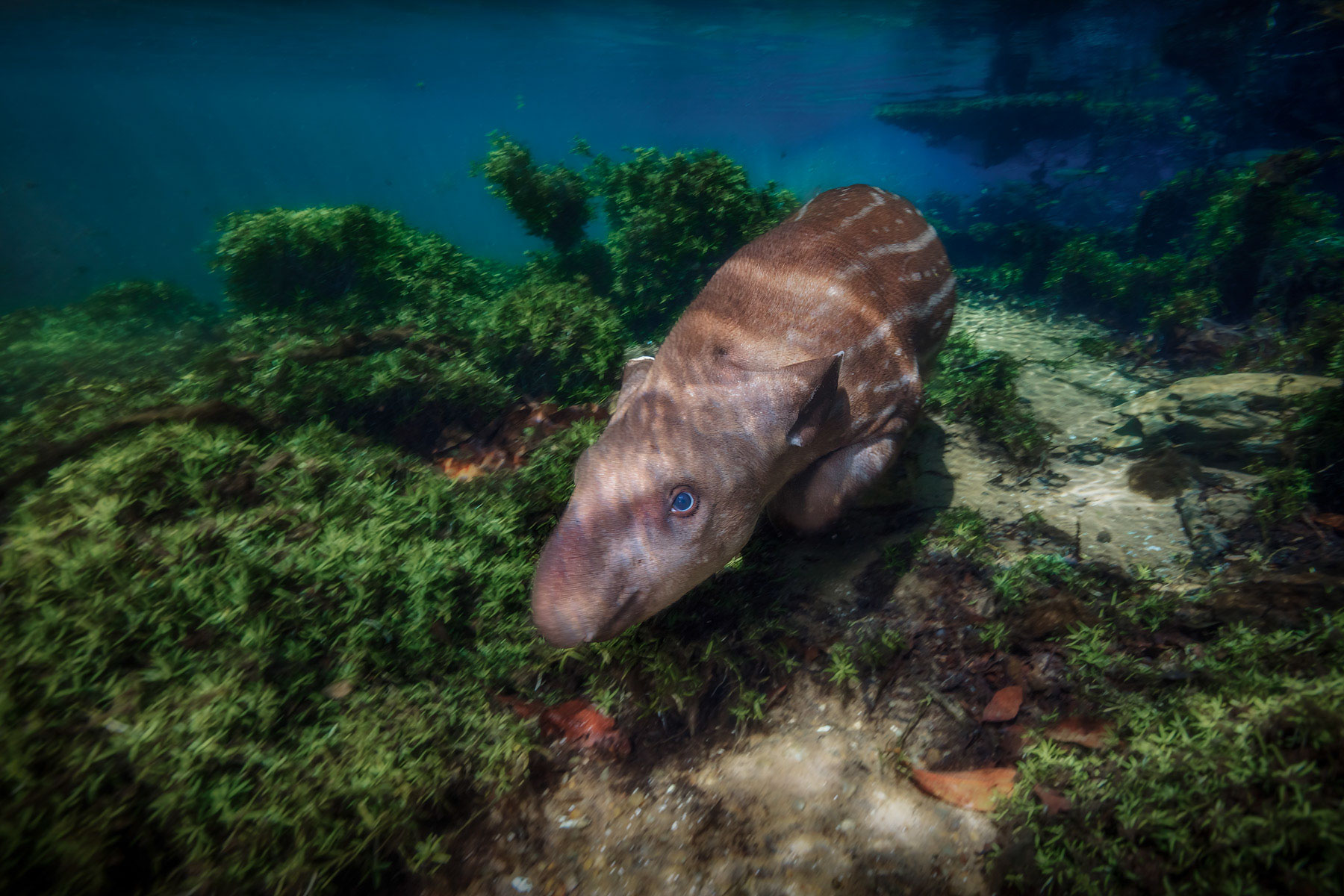Cucciolo di tapiro, riconoscibile dal caratteristico mantello marrone con strisce bianche, che scompariranno con la crescita. © Marcio Cabral