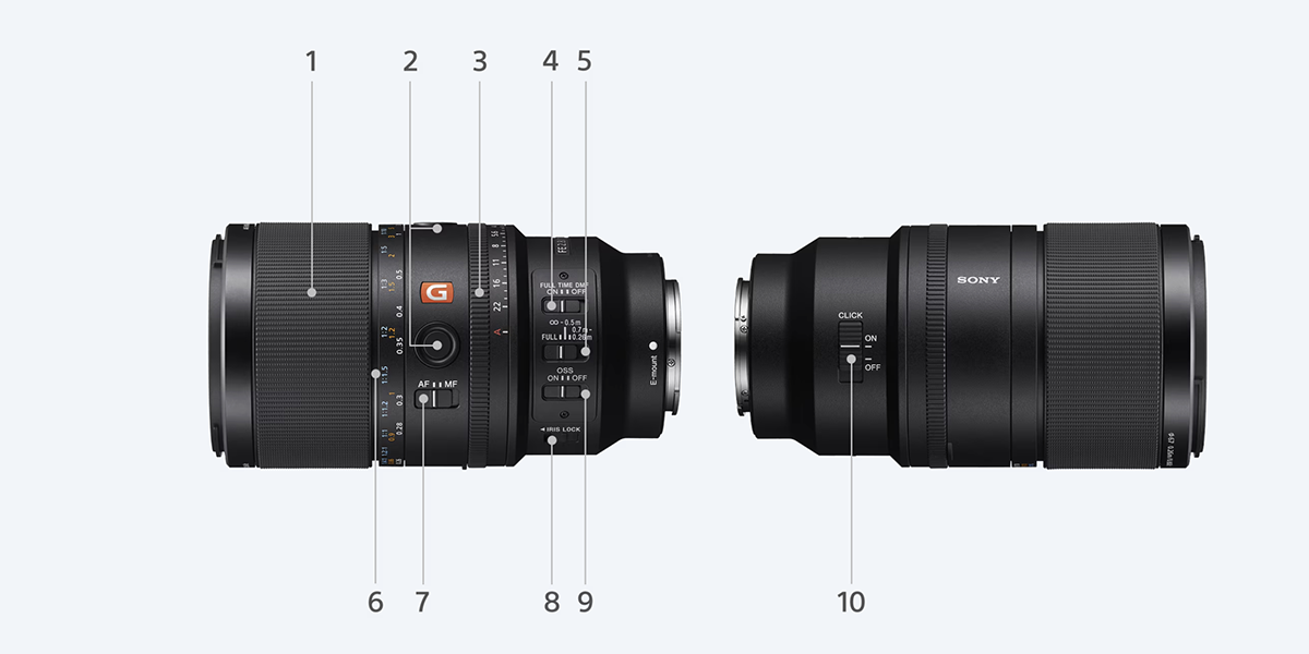 I comandi distribuiti sul corpo dell'obiettivo prevedono la ghiera di messa a fuoco scorrevole (1,6), un tasto funzione Fn (2), il selettore AF/MF (7), la ghiera dei diaframmi (3), il cursore DMF (4) e il limitatore di campo AF (5), l'interruttore per attivare e disattivare lo stabilizzatore (9), il blocco del diaframma (8) e il selettore per attivare e disattivare i click-stop (10).