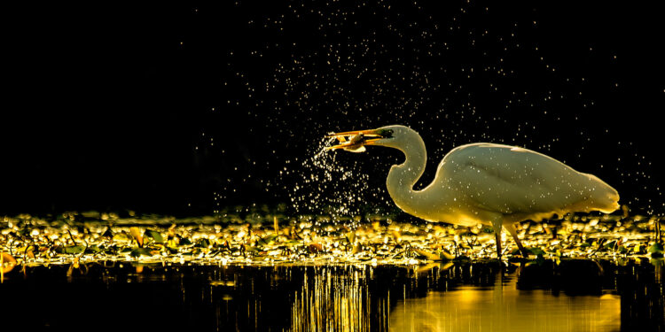 L’airone bianco, appartenente alla famiglia degli ardeidi, è dotato di grande pazienza ed è in grado di rimanere a lungo immobile, finché non avvista una preda abbastanza vicina da poter essere infilzata con il becco attraverso un gesto fulmineo. Questo esemplare ha deciso di cacciare nei pressi di una striscia di luce riflessa nell’acqua della palude dell’Oasi WWF Lago di Alviano, in provincia di Terni, consentendomi di ottenere un’immagine dall’atmosfera suggestiva, quasi surreale.