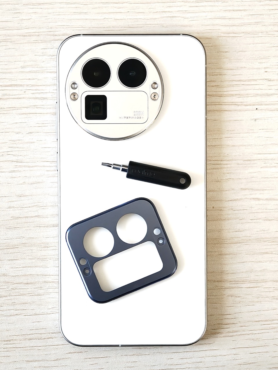Se la concorrenza marchiata Zeiss e Hasselblad ha puntato su design con custodie e piastre per sfruttare le ottiche intercambiabili (al momento un solo obiettivo teleconverter, però), i tecnici Realme hanno applicato il concetto all’estetica dello smartphone, con una mossa che di per sé è anche interessante. In un mondo che si divide tra chi preferisce l’isola che ospita i moduli fotografici rotonda e chi invece predilige forme più squadrate, Realme permette di personalizzare quell’area con delle maschere, installabili tramite un paio di piccole viti con testa torx.