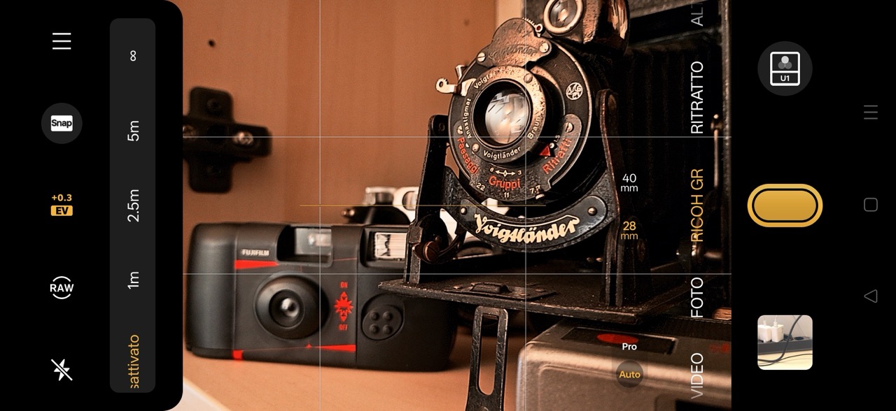 Tra le opzioni messe a disposizione dal pannello di scatto Ricoh GR su Realme GT 8 Pro c’è anche la modalità “Snap“, che vuole introdurre il concetto di messa a fuoco a zone, con passi fissati su 1m, 2,5m, 5m e infinito. Non avendo controllo reale della profondità di campo (l’ottica non ha il diaframma), questa modalità è decisamente meno utile che su una fotocamera e sono poche le situazioni in cui risulta veramente utilizzabile.