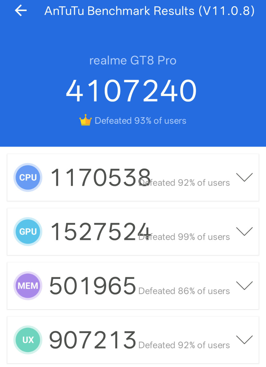 Il Realme GT 8 Pro si presenta come un top di gamma senza compromessi, equipaggiato con il processore Qualcomm Snapdragon 8 Elite Gen 5, realizzato con il processo a 3nm di seconda generazione di TSMC. Questa piattaforma, supportata da RAM LPDDR5X e storage UFS 4.1, promette un incremento delle prestazioni della CPU del 20% e della GPU del 23%, raggiungendo punteggi benchmark AnTuTu superiori ai 4 milioni. Noi abbiamo registrato ben 4.107.240.