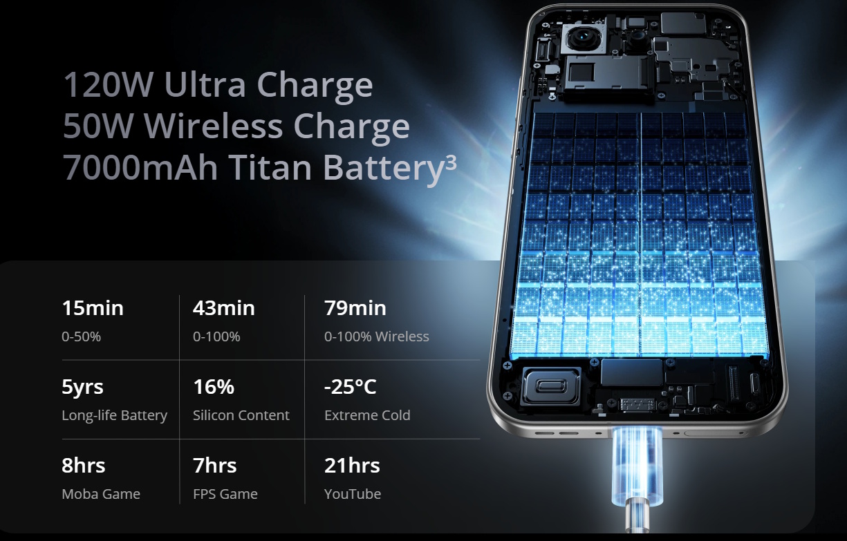 Il dispositivo è alimentato da una batteria da 7.000mAh, con una configurazione a doppia cella 2×3.500mAh. La ricarica cablata SuperVOOC a 120W permette di raggiungere il 50% in 15 minuti e il 100% in 43 minuti. La ricarica wireless a 50W raggiunge il 100% in 79 minuti. La vita della batteria è stimata in oltre 5 anni.