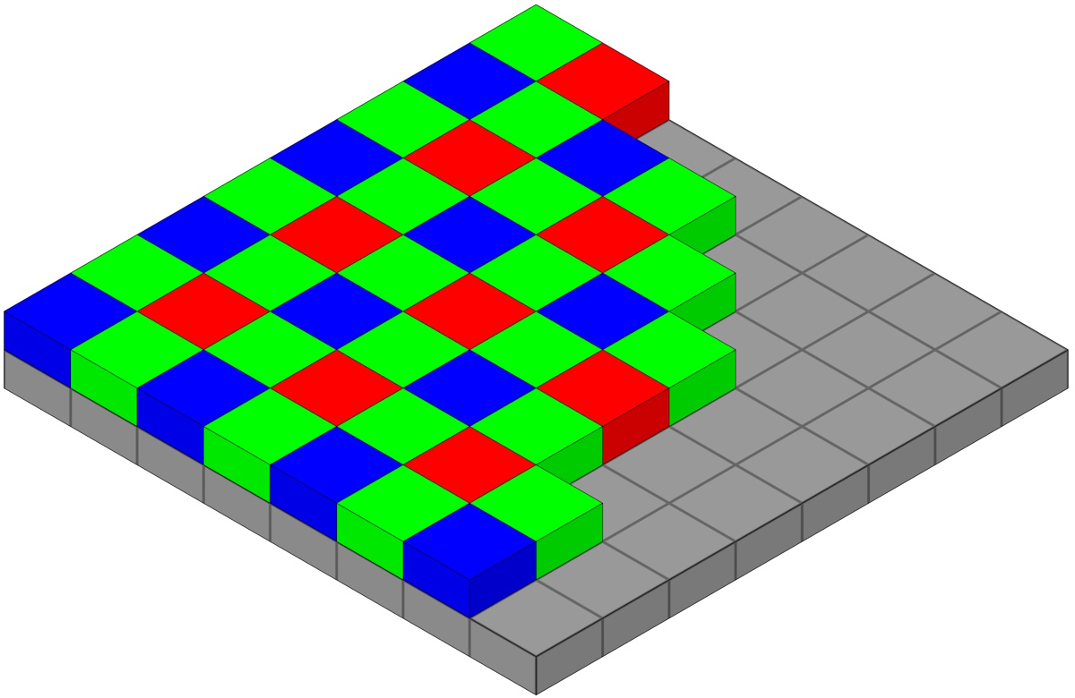 I sensori digitali che troviamo sulle nostre fotocamere vedono a colori tramite l’artificio della matrice Bayer RGB, che ripete su tutto il sensore un gruppo di 4 pixel (2 verdi, 1 rosso e 1 blu), demandando al processore d’immagine il lavoro di demosaicizzazione, ossia di ricostruzione, tramite le informazioni dei pixel adiacenti, delle tre componenti colore in ogni singolo pixel.