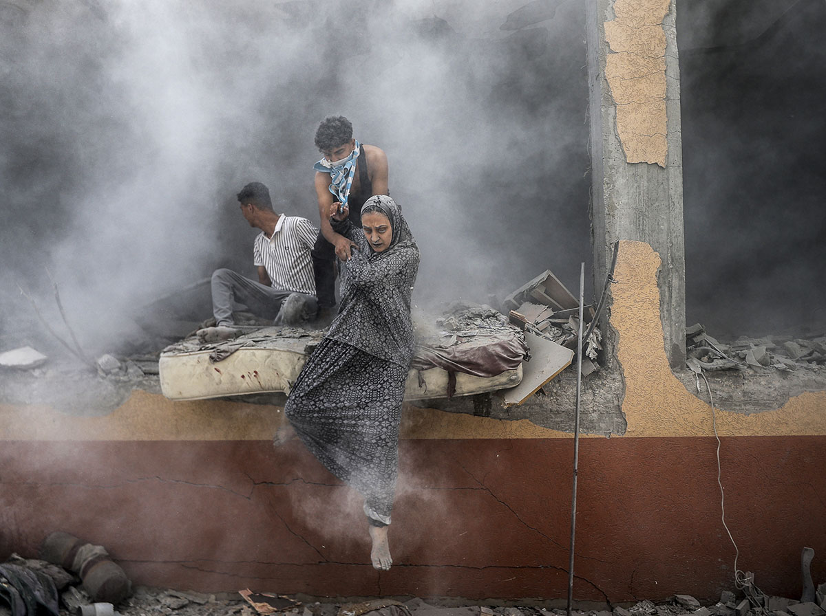 Il palestinese Ali Jadallah si è aggiudicato il titolo di vincitore assoluto dei Siena International Photo Awards con la fotografia intitolata Leaving home. L’immagine, scattata il 14 giugno 2024 a Deir al-Balah, nella Striscia di Gaza, ritrae tre persone che, in una nube di polvere, emergono dalle macerie della propria abitazione dopo un violento attacco israeliano.