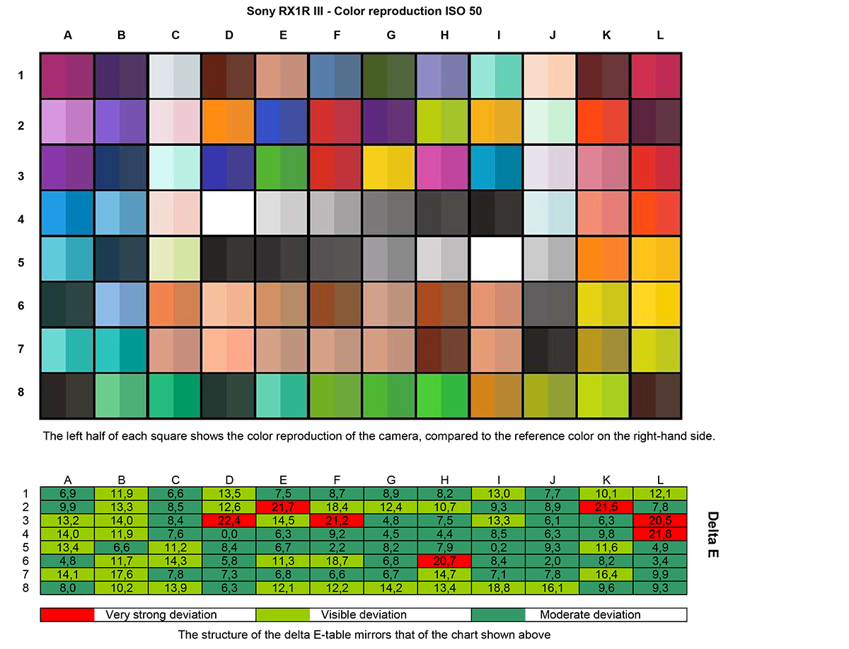 La riproduzione del colore è mostrata nel grafico qui sopra in due modi. Con i tasselli colorati si confronta un colore di riferimento (la metà destra) con quello riprodotto dalla fotocamera (rappresentato della metà sinistra). Nella tabella inferiore, invece, sono riportati i valori numerici dello scostamento cromatico tra il target di riferimento e la riproduzione cromatica della fotocamera. I marcatori in rosso indicano forti deviazioni di colore, quelli in verde chiaro una deviazione evidente e in verde scuro sono invece evidenziate le deviazioni di entità moderata. Dalla riproduzione dei colori della Sony RX1R III emerge una deviazione significativa in sette tonalità, specialmente nei rossi e nei magenta, toni che si discostano notevolmente dai valori di riferimento. Il risultato, tuttavia, resta comunque apprezzabile e al di sopra della media rilevata con modelli simili.