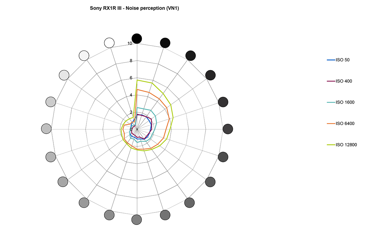 Nella ragnatela qui sopra mostriamo il comportamento della Sony RX1R III in termini di comparsa del rumore a varie sensibilità ISO (rappresentate nel grafico dalle linee colorate) in funzione della luminosità dell’immagine target, che è indicata dalla densità dei cerchi posizionati lungo la circonferenza. Quelli più scuri rappresentano le aree in ombra di un’immagine, mentre i più chiari indicano le alteluci. Maggiore è l’area circoscritta dalle linee colorate, maggiore è il rumore. Nel caso della Sony RX1RM3, il controllo del rumore è buono per le immagini visualizzate su uno schermo piccolo o anche su stampe di grande formato, ma meno apprezzabile a monitor con ingrandimento al 100%. In quest’ultima condizione, il rumore risulta visibile già a 400 ISO (vedi carosello di immagini in alto).