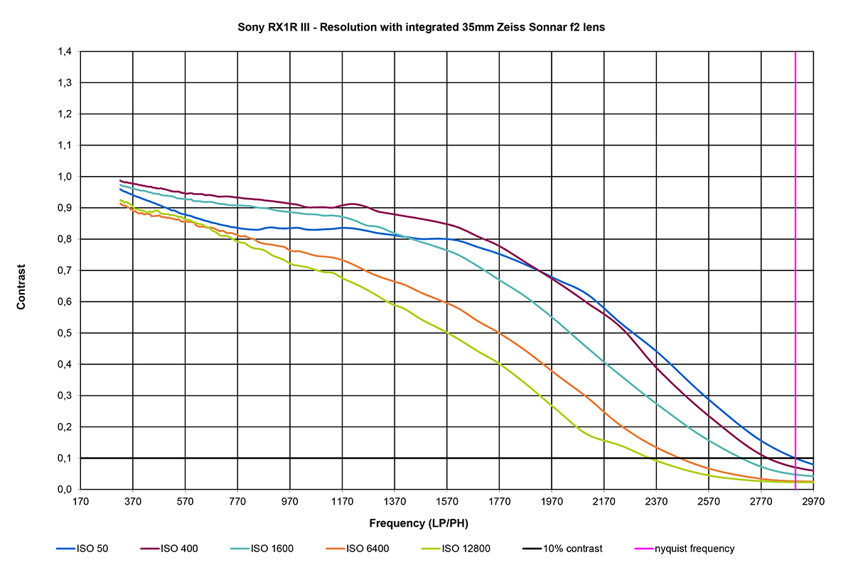 Il grafico della Risoluzione mostra la perdita del contrasto (sull’asse verticale y) in funzione della frequenza spaziale espressa in coppie di linee per altezza immagine, indicate dal rapporto LP/PH, ossia Line pairs/Picture height (asse orizzontale x). Più la curva si protende verso destra prima di piegare verso il basso, migliore è la risoluzione a quella data sensibilità. La risoluzione limite per ogni valore ISO può essere trovata laddove la curva attraversa la linea nera spessa, ossia dove il contrasto è pari a 0,1. La linea rosa verticale è un riferimento che rappresenta invece la “frequenza di Nyquist”, ossia il limite teorico massimo di risoluzione, pari alla metà dei pixel in altezza di ogni sensore. La risoluzione della Sony RX1RM3 alla minima sensibilità testata (50 ISO) raggiunge il 90% del massimo teorico e 2847 coppie di linee per millimetro risolte, ma resta consistente almeno fino a1600 ISO, valore in cui si registra un decremento di appena 5 punti percentuali. A 6400 ISO la RX1RIII si esprime al 78% del potenziale e scende al 74% a 12.800 ISO.