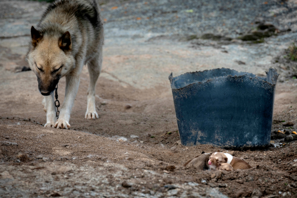 Nelle fotografie che compongono la serie scattata da Stefano Balma le persone sono pressoché assenti. In compenso, ci sono tanti cani da slitta, nella maggior parte dei casi incatenati per evitare che si attacchino a vicenda. “Se nella stagione invernale i cani vengono abbondantemente nutriti e lasciati liberi”, precisa Stefano, “durante l’estate mangiano una sola volta al giorno e questo incide sulla loro aggressività, che li indurrebbe ad azzannarsi a vicenda qualora non fossero legati”.