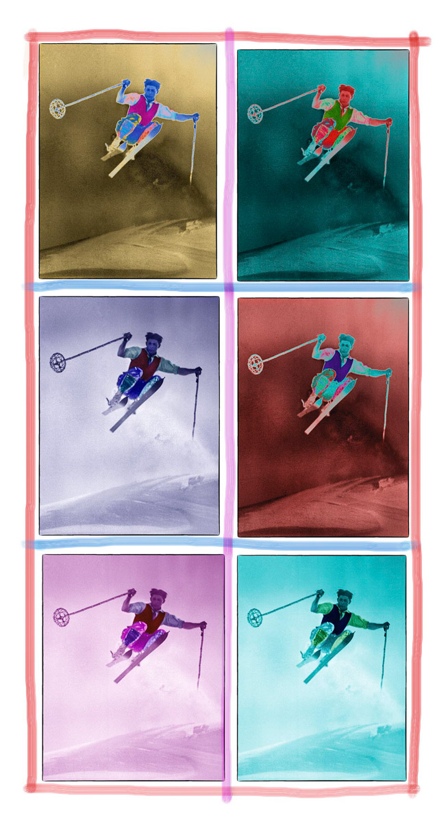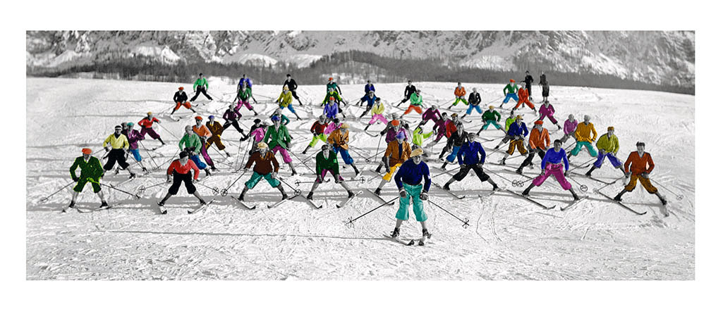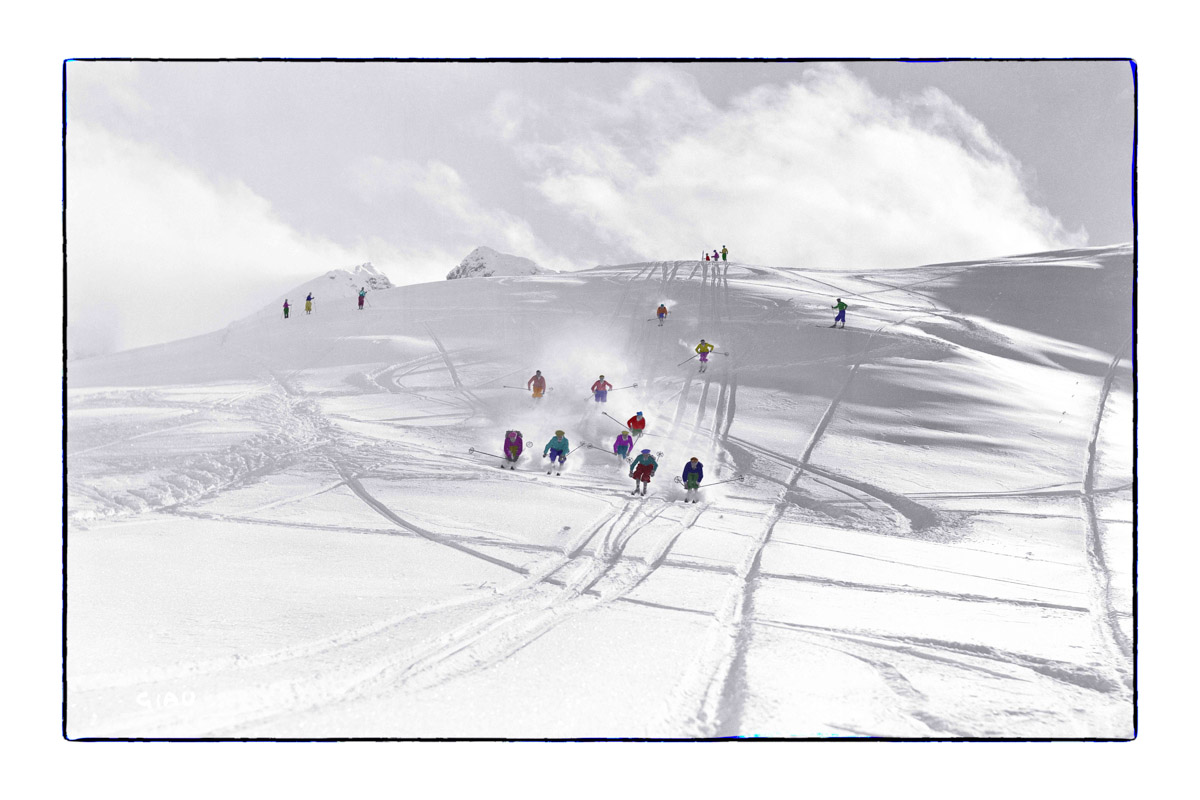 Gli scatti utilizzati come punto di partenza raccontano la nascita del turismo invernale in montagna, una completa novità per l’epoca. Stefano Zardini non cancella e non sovrascrive nulla: amplifica, con un’innovativa operazione concettuale ed espressiva. Le immagini monocromatiche di inizio Novecento, rigenerate dai suoi interventi, acquistano nuova luce e trasmettono una nuova energia, mettendo spesso in primo piano i rudimentali sci di legno allacciati con cinghie di cuoio che avviarono una rivoluzione colorata, entusiasta e capace di sognare in grande.