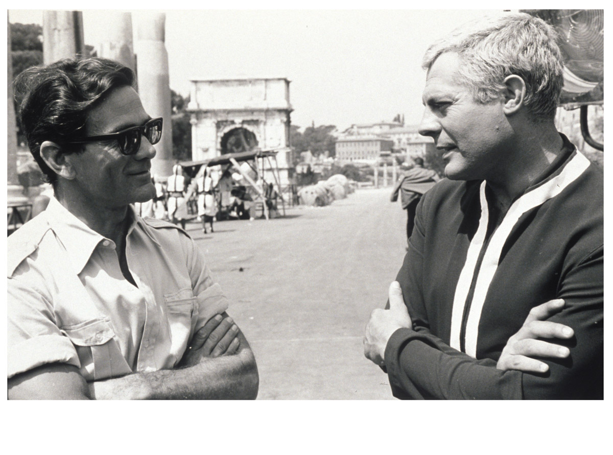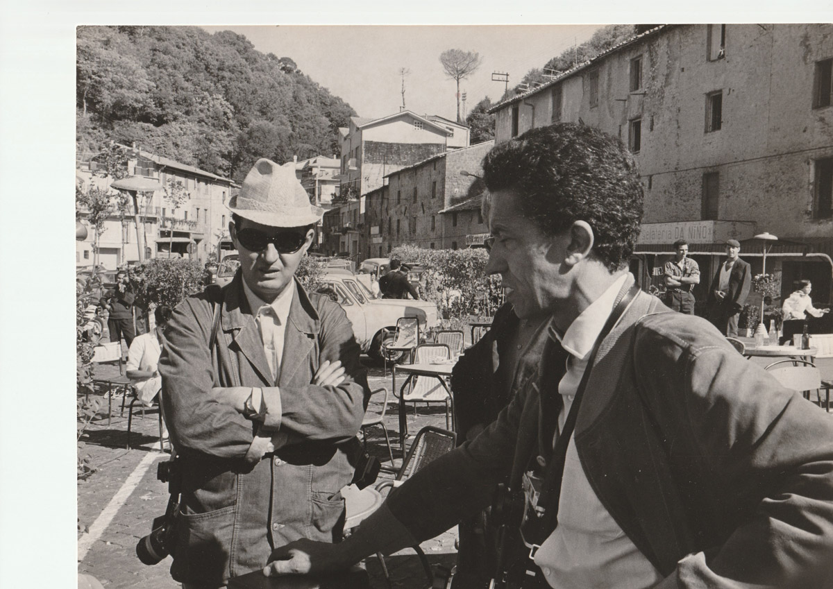 Pier Paolo Pasolini in visita sul set, con Marcello Mastroianni. Fotografia di Tazio Secchiaroli. © David Secchiaroli, cortesia FPC