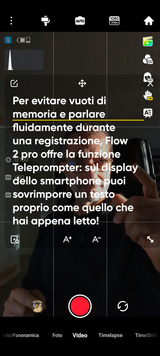Una volta bilanciato il gimbal, l’app diventa la console di controllo del sistema di ripresa: permette di regolare risoluzione video e frame rate (a seconda del modello di smartphone) e, cosa più importante, di tarare finemente il comportamento del gimbal, dalla velocità di rotazione alla reattività del joystick e della ghiera fisica. Non mancano strumenti avanzati di assistenza visiva, come la griglia e l’istogramma, oltre a una suite completa di modalità creative come la ripresa panoramica, quelle Timelapse e TimeShift, e il celebre effetto Dolly Zoom (zoom avanti e carrello indietro, per dirla in gergo cinematografico).