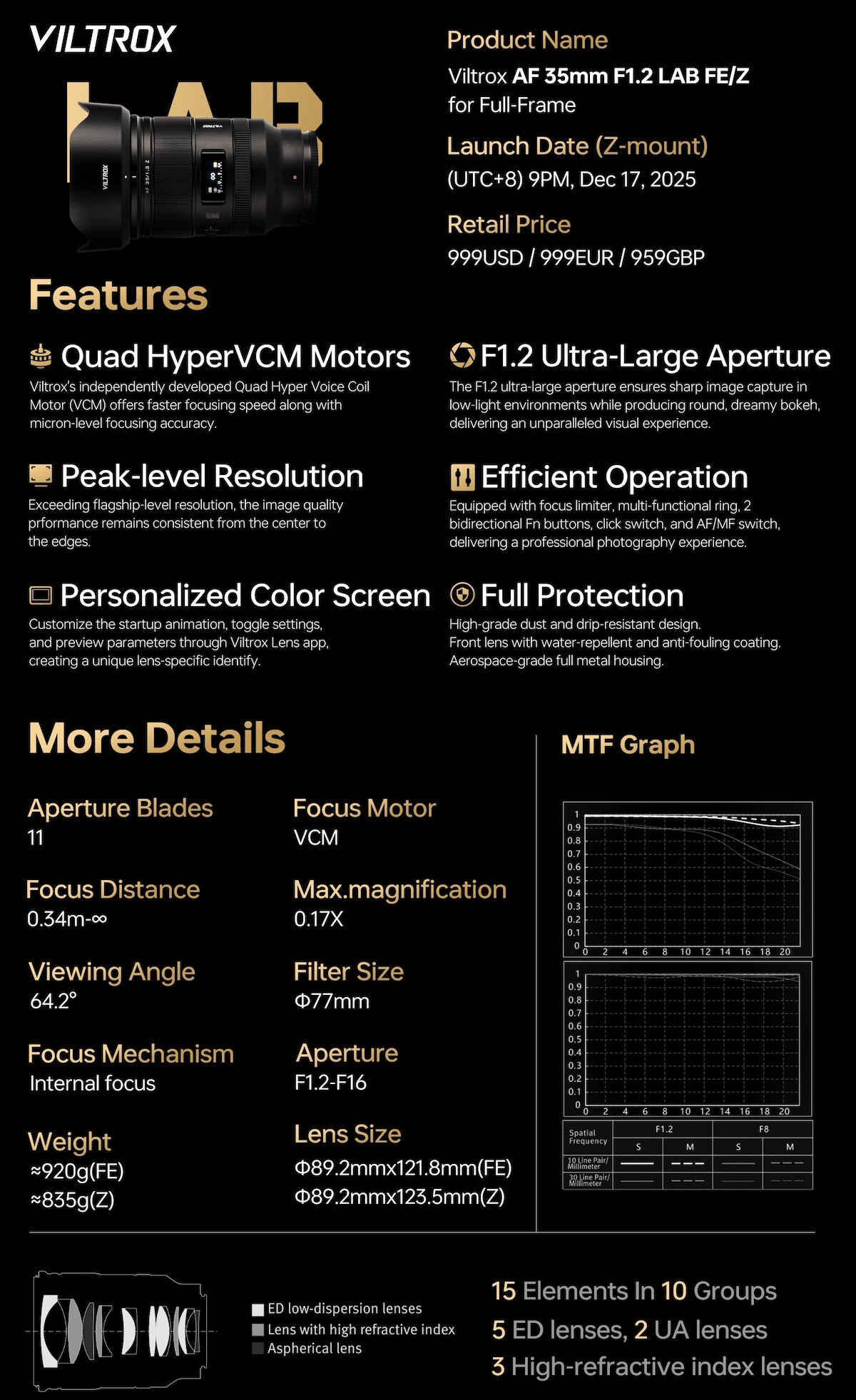 Una tabella riassuntiva permette di avere sott'occhio tutti le specifiche tecniche del nuovo Viltrox 35mm F1.2 LAB con attacco Z.
