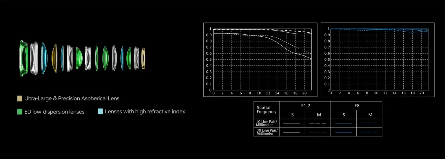 L'obiettivo è composto da 15 elementi in 10 gruppi, tra cui cinque lenti ED, tre lenti ad alto indice di rifrazione e due lenti asferiche, puntando a garantire nitidezza dal centro ai bordi anche a tutta apertura.